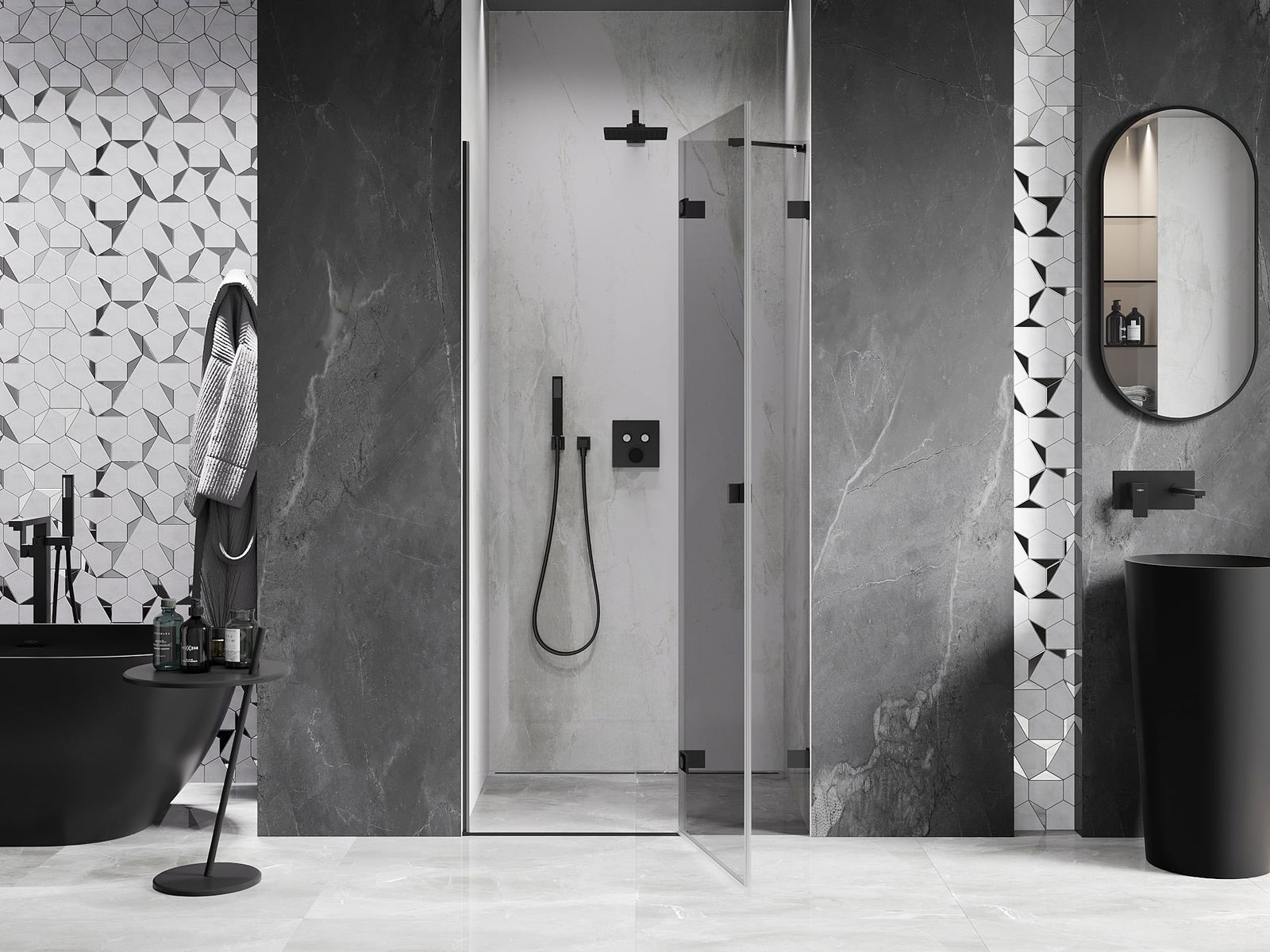 La poignée pratique et confortable est fabriquée en métal durable et résistant. Sa forme à la mode, combinée à une finition assortie à la couleur des profilés, donne à l'ensemble un aspect moderne et stylé, soulignant l'esthétique de chaque salle de bain.