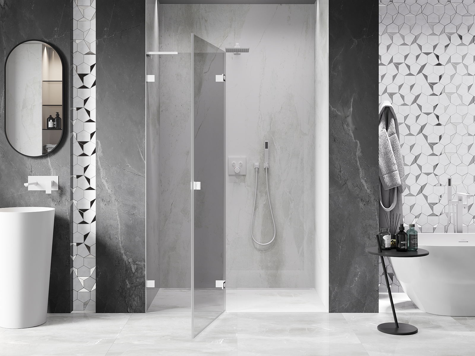 La poignée pratique et confortable est fabriquée en métal durable et résistant. Sa forme à la mode, combinée à une finition assortie à la couleur des profilés, donne à l'ensemble un aspect moderne et stylé, soulignant l'esthétique de chaque salle de bain.