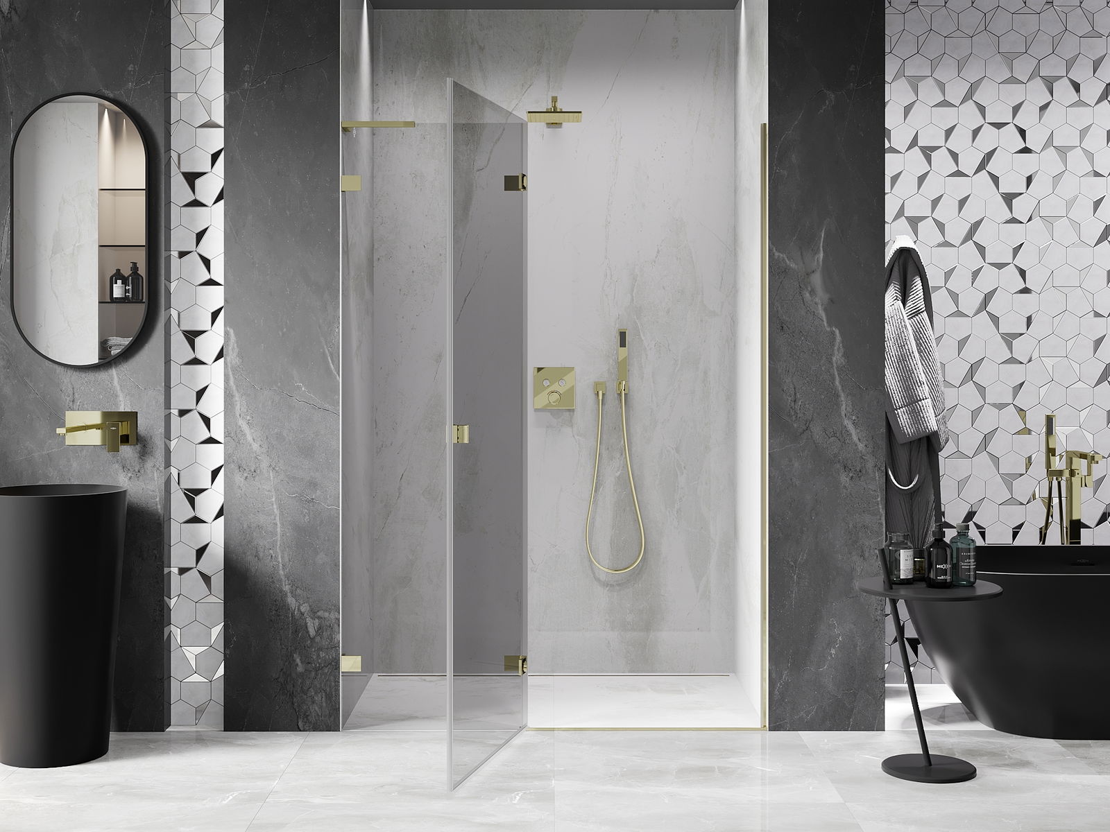 La poignée pratique et confortable est fabriquée en métal durable et résistant. Sa forme à la mode, combinée à une finition assortie à la couleur des profilés, donne à l'ensemble un aspect moderne et stylé, soulignant l'esthétique de chaque salle de bain.
