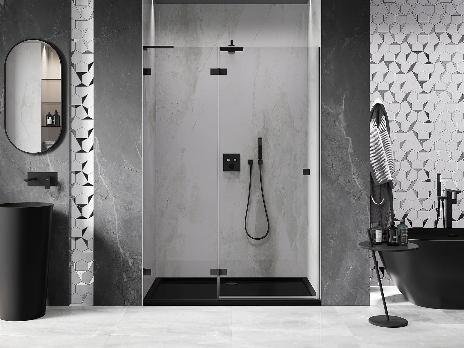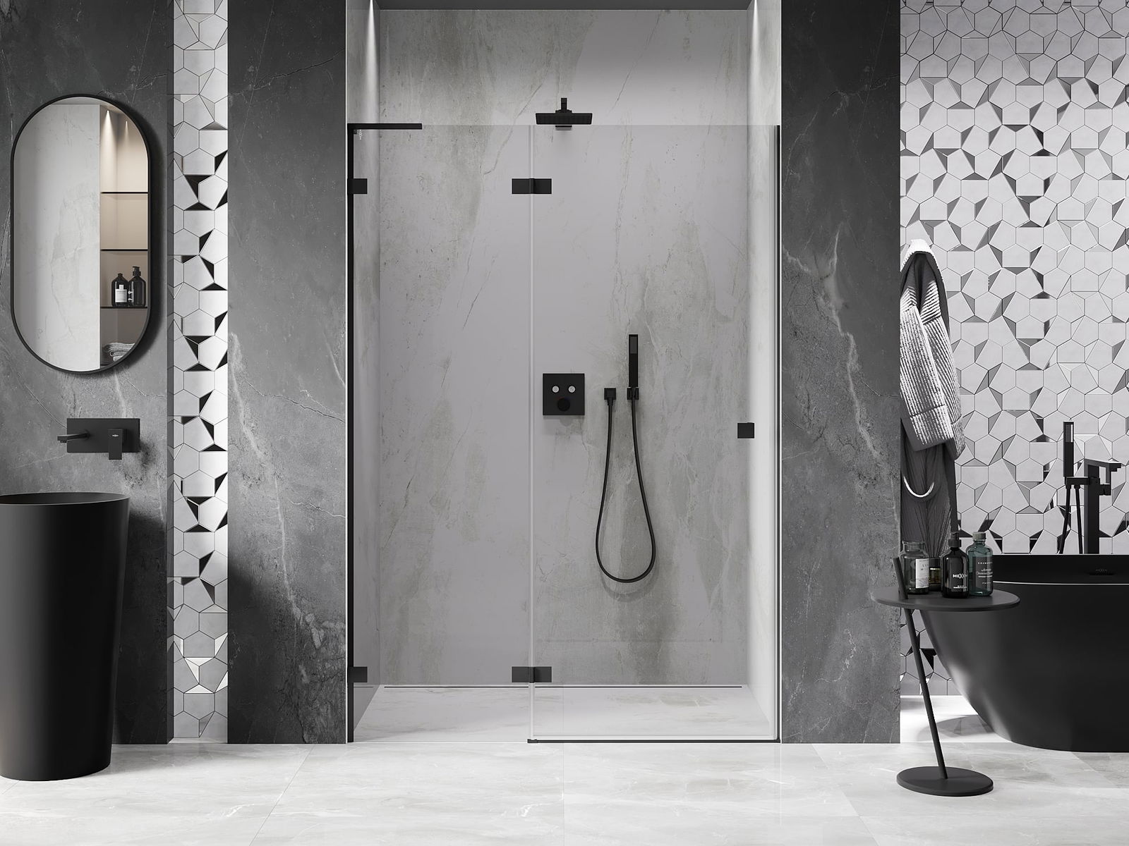 La poignée pratique et confortable est fabriquée en métal durable et résistant. Sa forme à la mode, combinée à une finition assortie à la couleur des profilés, donne à l'ensemble un aspect moderne et stylé, soulignant l'esthétique de chaque salle de bain.