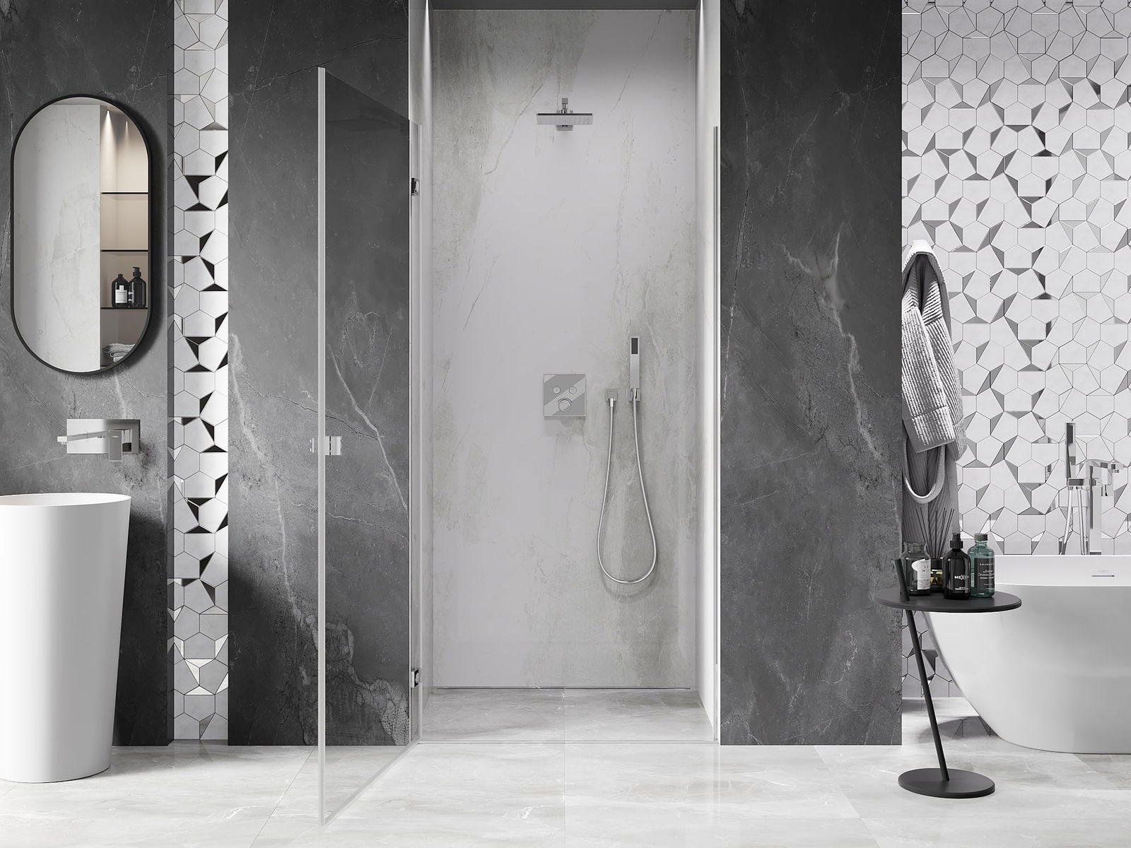 La poignée pratique et confortable est fabriquée en métal durable et résistant. Sa forme à la mode, combinée à une finition assortie à la couleur des profilés, donne à l'ensemble un aspect moderne et stylé, soulignant l'esthétique de chaque salle de bain.