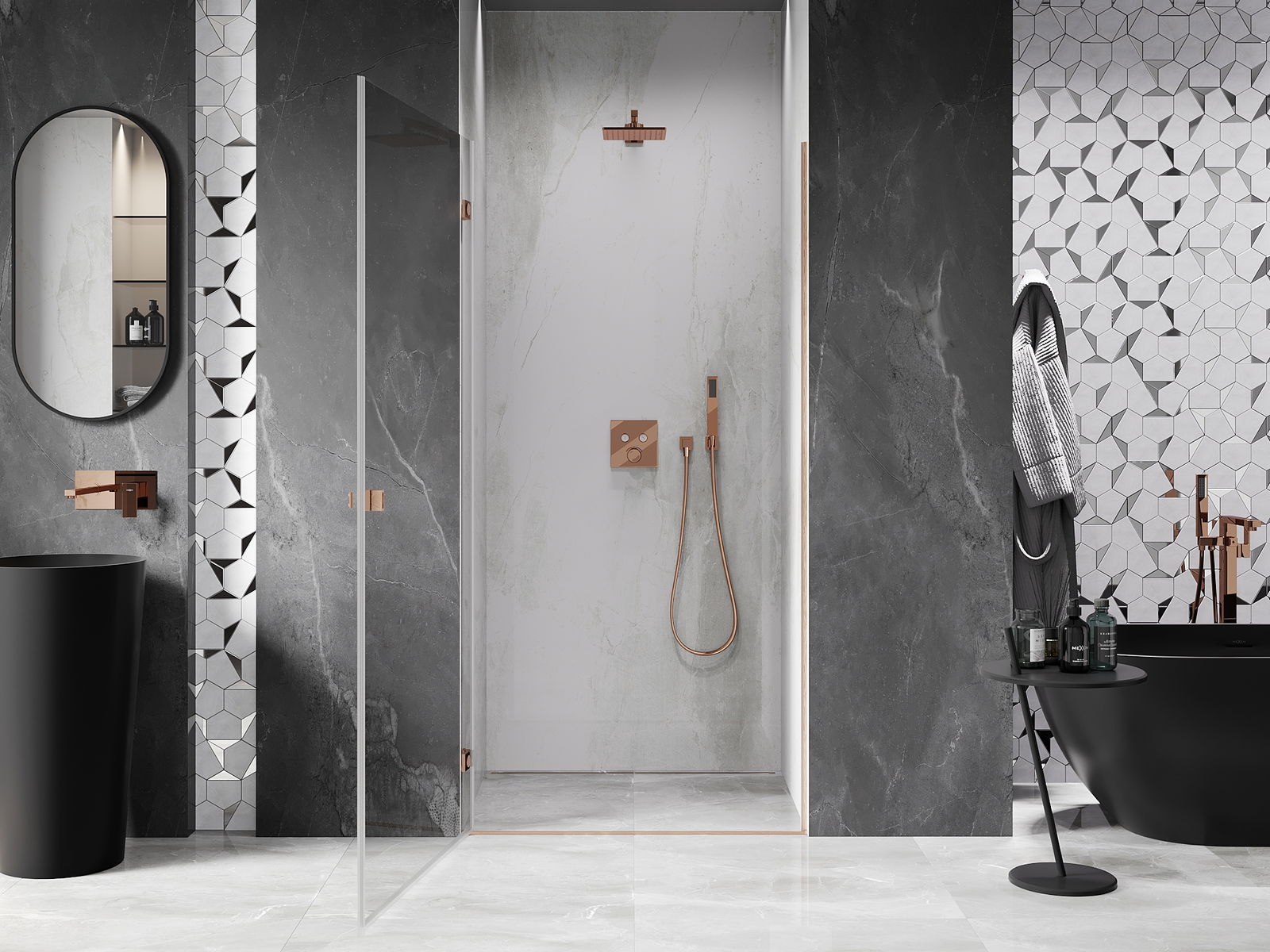 La poignée pratique et confortable est fabriquée en métal durable et résistant. Sa forme à la mode, combinée à une finition assortie à la couleur des profilés, donne à l'ensemble un aspect moderne et stylé, soulignant l'esthétique de chaque salle de bain.