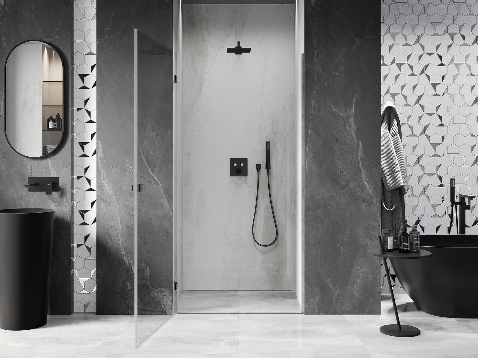 La poignée pratique et confortable est fabriquée en métal durable et résistant. Sa forme à la mode, combinée à une finition assortie à la couleur des profilés, donne à l'ensemble un aspect moderne et stylé, soulignant l'esthétique de chaque salle de bain.