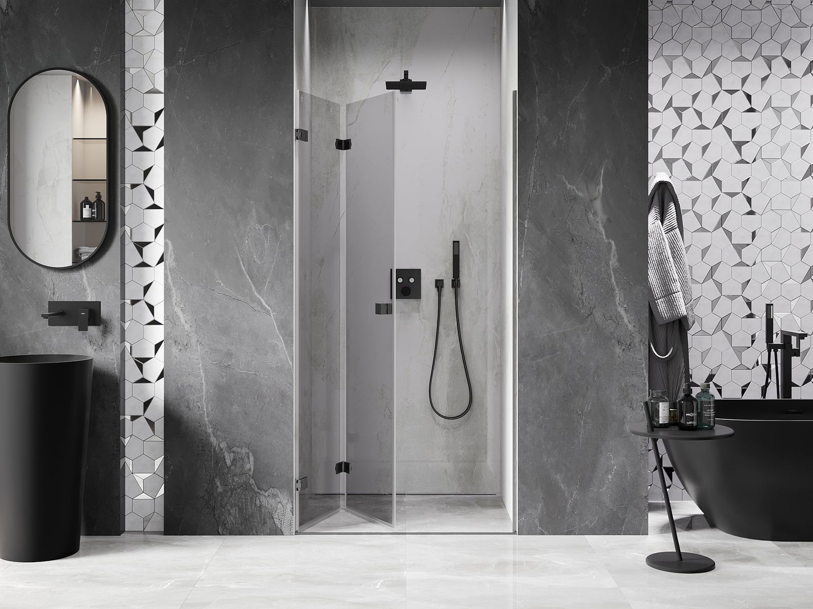 La poignée pratique et confortable est fabriquée en métal durable et résistant. Sa forme à la mode, combinée à une finition assortie à la couleur des profilés, donne à l'ensemble un aspect moderne et stylé, soulignant l'esthétique de chaque salle de bain.