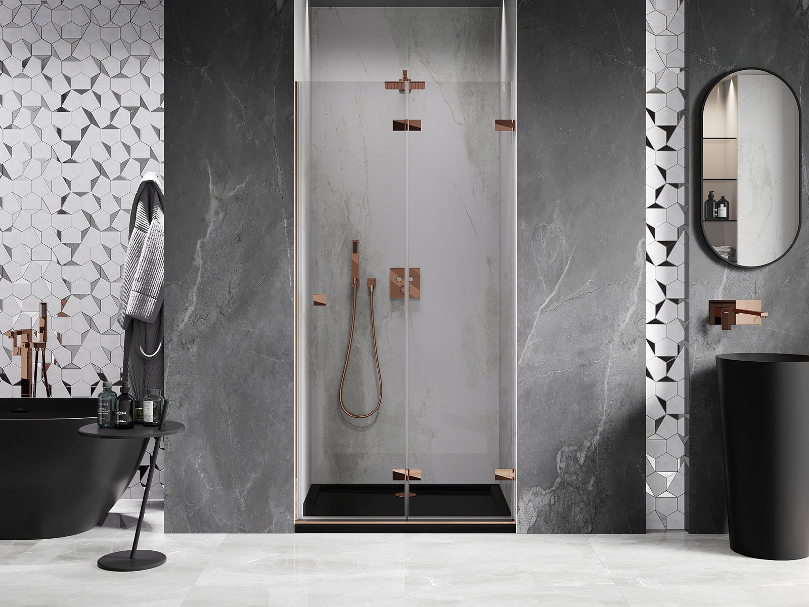 La poignée pratique et confortable est fabriquée en métal durable et résistant. Sa forme à la mode, combinée à une finition assortie à la couleur des profilés, donne à l'ensemble un aspect moderne et stylé, soulignant l'esthétique de chaque salle de bain.