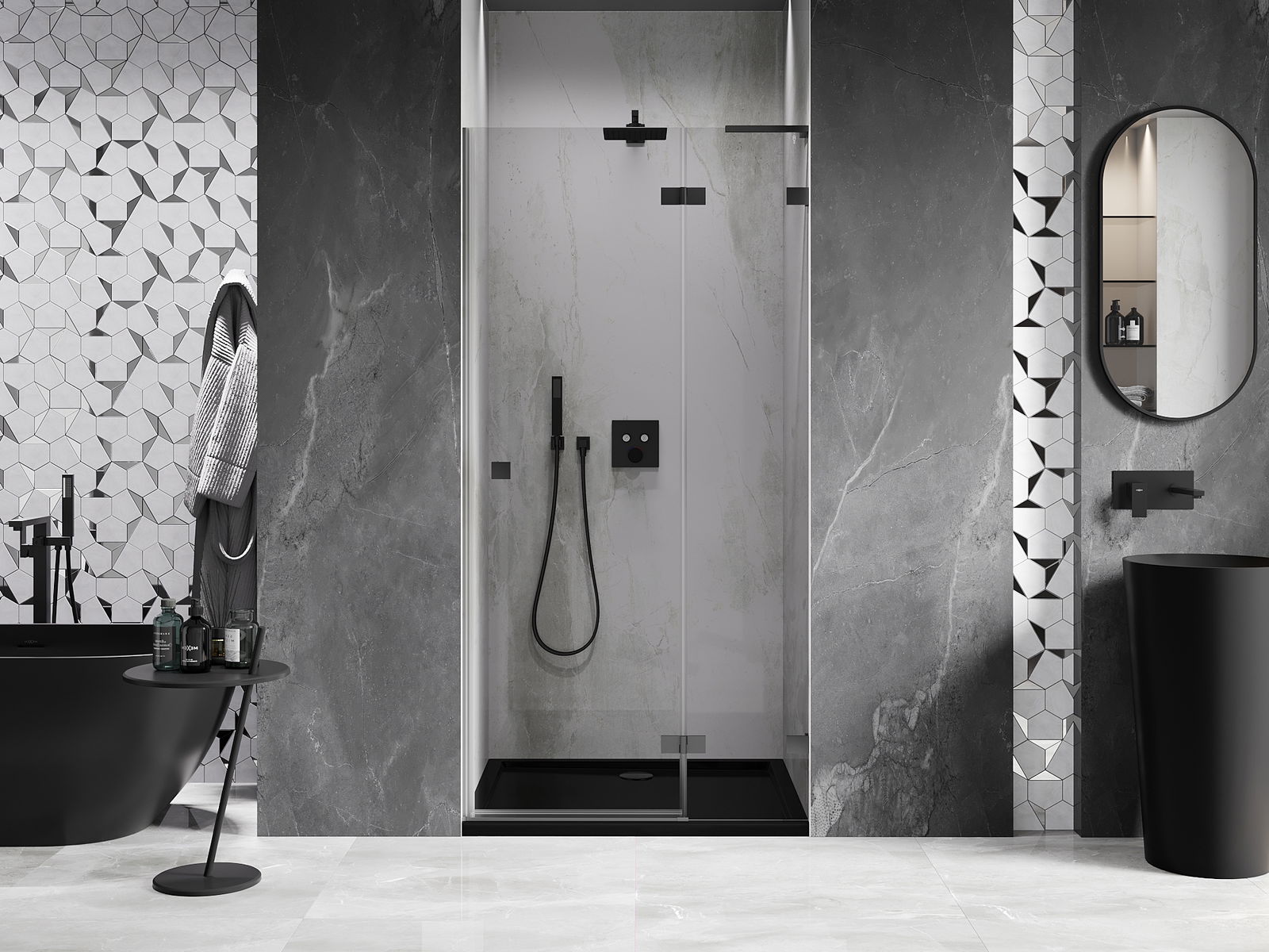 La poignée pratique et confortable est fabriquée en métal durable et résistant. Sa forme à la mode, combinée à une finition assortie à la couleur des profilés, donne à l'ensemble un aspect moderne et stylé, soulignant l'esthétique de chaque salle de bain.