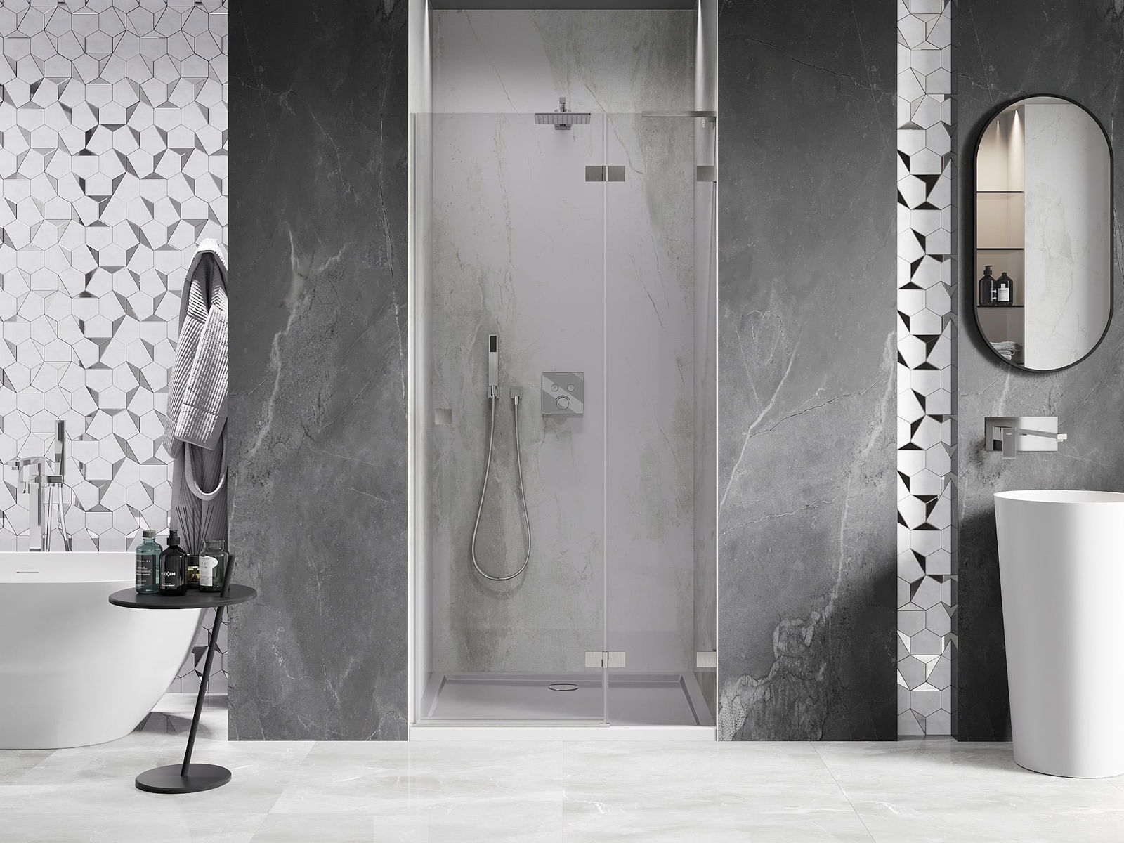 La poignée pratique et confortable est fabriquée en métal durable et résistant. Sa forme à la mode, combinée à une finition assortie à la couleur des profilés, donne à l'ensemble un aspect moderne et stylé, soulignant l'esthétique de chaque salle de bain.