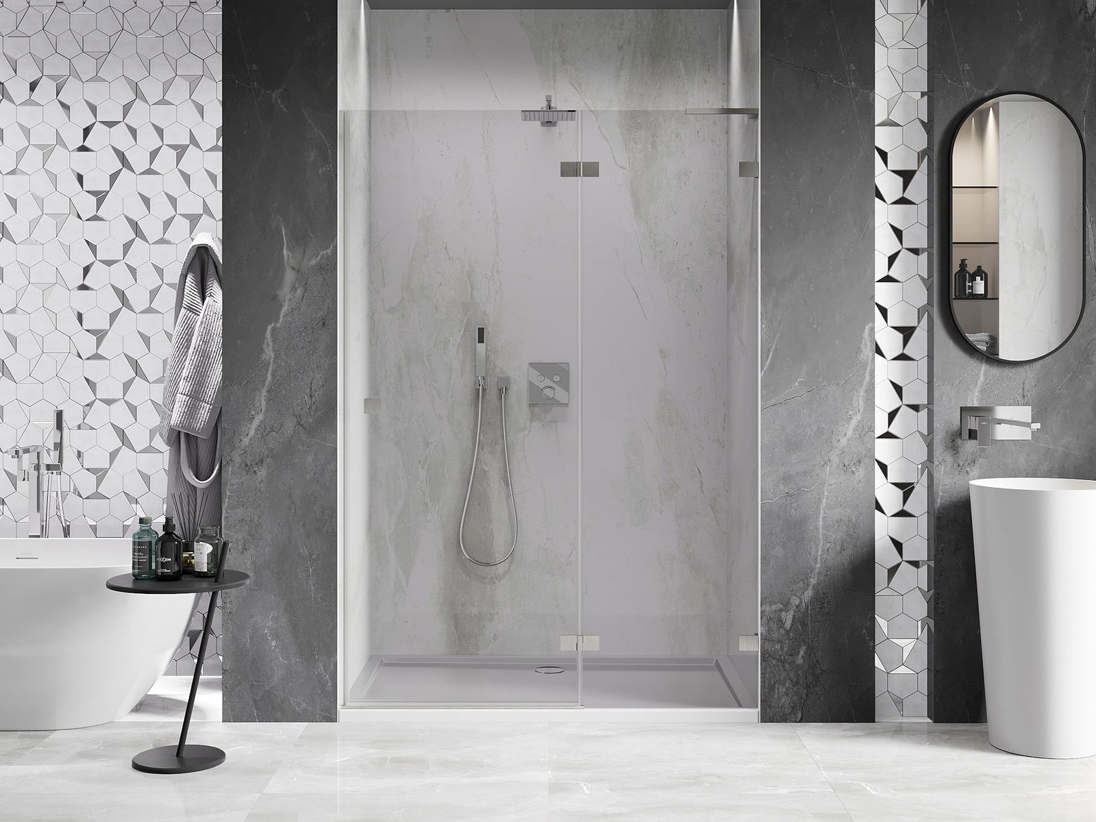 La poignée pratique et confortable est fabriquée en métal durable et résistant. Sa forme à la mode, combinée à une finition assortie à la couleur des profilés, donne à l'ensemble un aspect moderne et stylé, soulignant l'esthétique de chaque salle de bain.