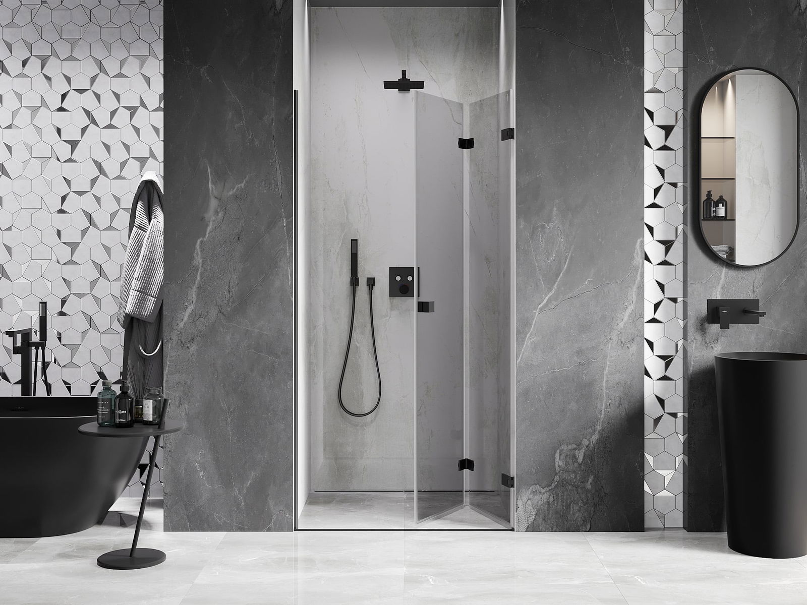 La poignée pratique et confortable est fabriquée en métal durable et résistant. Sa forme à la mode, combinée à une finition assortie à la couleur des profilés, donne à l'ensemble un aspect moderne et stylé, soulignant l'esthétique de chaque salle de bain.