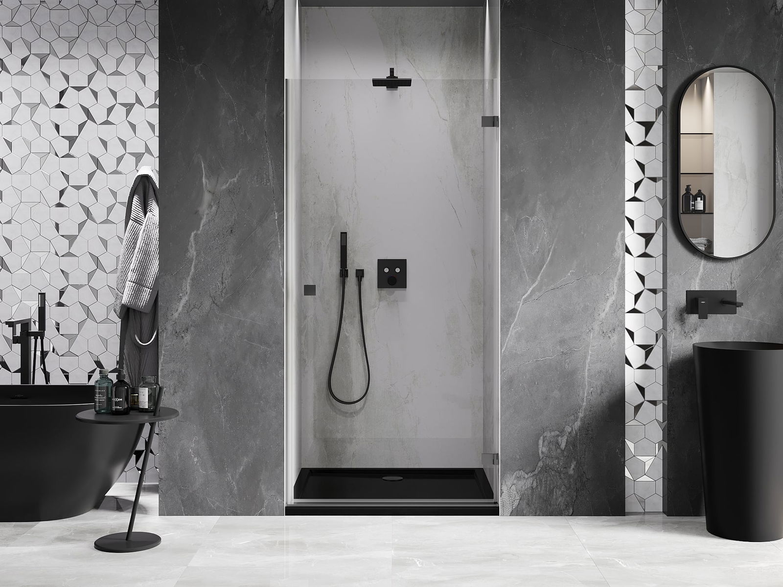 La poignée pratique et confortable est fabriquée en métal durable et résistant. Sa forme à la mode, combinée à une finition assortie à la couleur des profilés, donne à l'ensemble un aspect moderne et stylé, soulignant l'esthétique de chaque salle de bain.