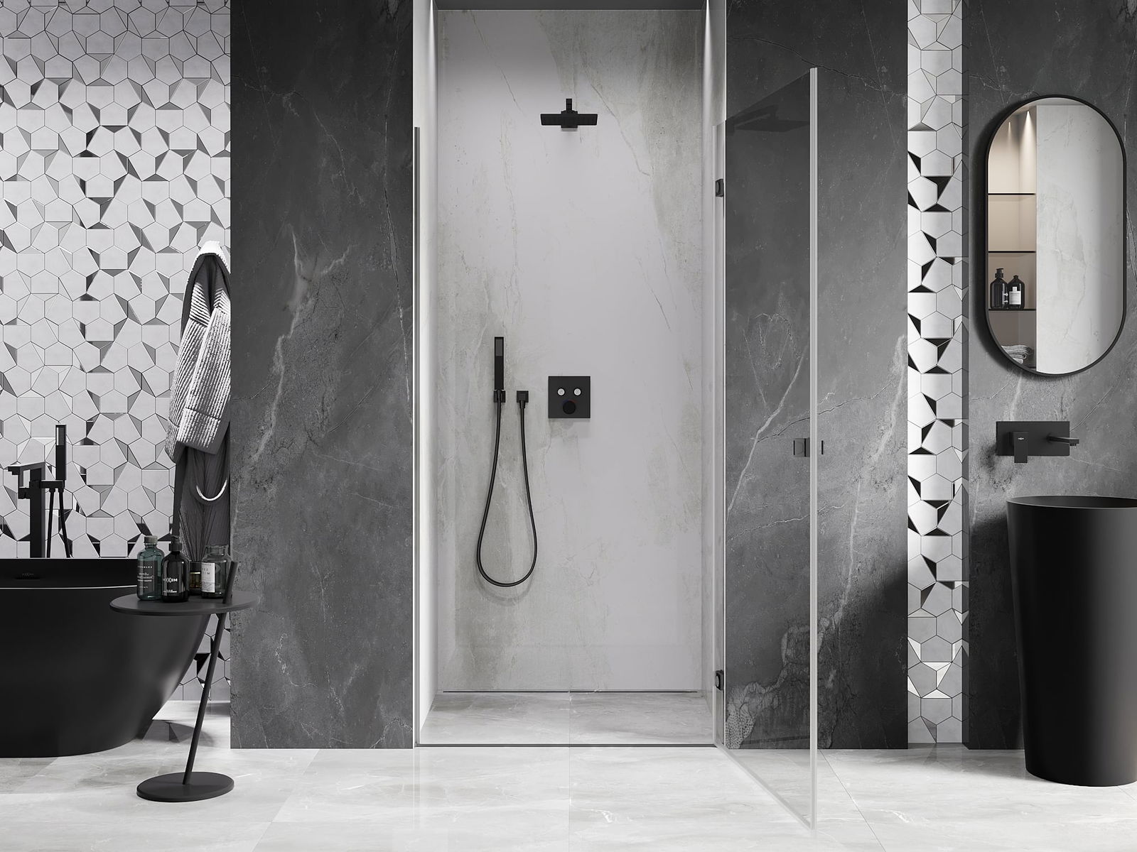 La poignée pratique et confortable est fabriquée en métal durable et résistant. Sa forme à la mode, combinée à une finition assortie à la couleur des profilés, donne à l'ensemble un aspect moderne et stylé, soulignant l'esthétique de chaque salle de bain.
