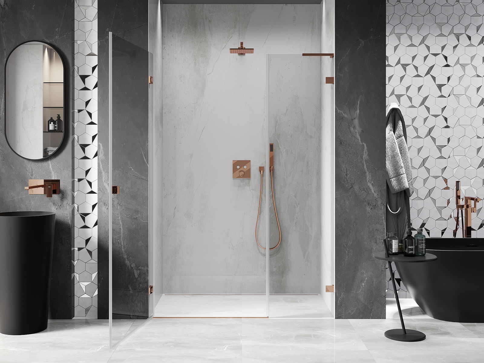 La poignée pratique et confortable est fabriquée en métal durable et résistant. Sa forme à la mode, combinée à une finition assortie à la couleur des profilés, donne à l'ensemble un aspect moderne et stylé, soulignant l'esthétique de chaque salle de bain.