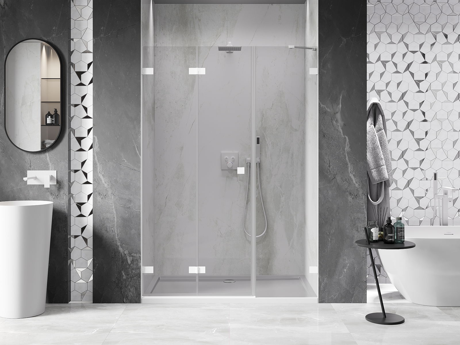 La poignée pratique et confortable est fabriquée en métal durable et résistant. Sa forme à la mode, combinée à une finition assortie à la couleur des profilés, donne à l'ensemble un aspect moderne et stylé, soulignant l'esthétique de chaque salle de bain.