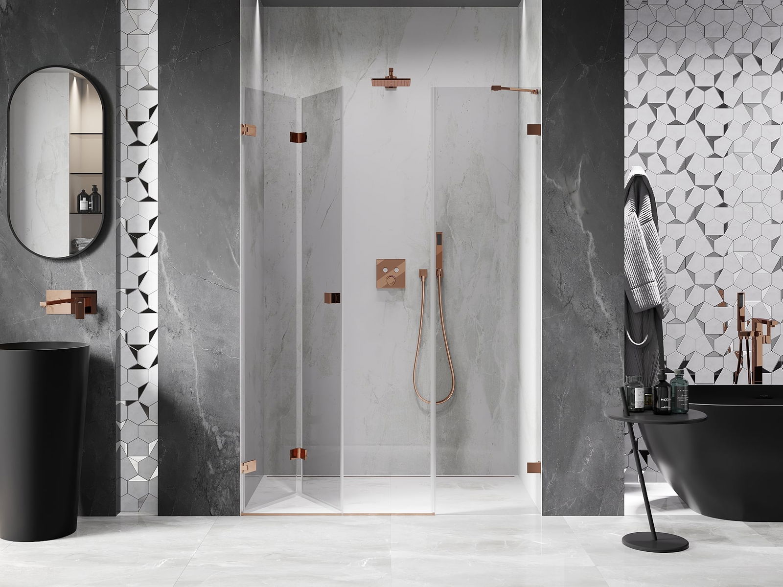 La poignée pratique et confortable est fabriquée en métal durable et résistant. Sa forme à la mode, combinée à une finition assortie à la couleur des profilés, donne à l'ensemble un aspect moderne et stylé, soulignant l'esthétique de chaque salle de bain.