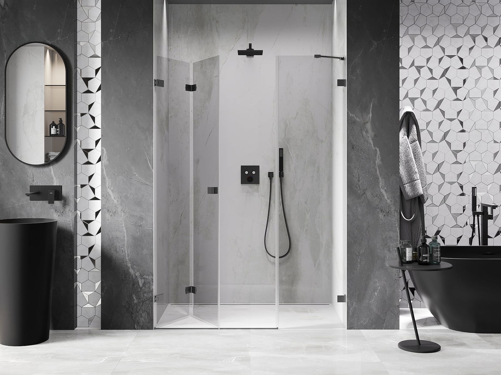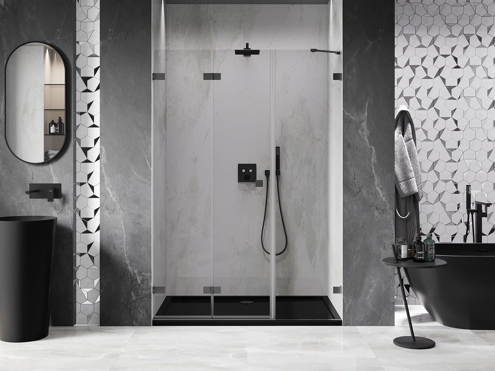 La poignée pratique et confortable est fabriquée en métal durable et résistant. Sa forme à la mode, combinée à une finition assortie à la couleur des profilés, donne à l'ensemble un aspect moderne et stylé, soulignant l'esthétique de chaque salle de bain.