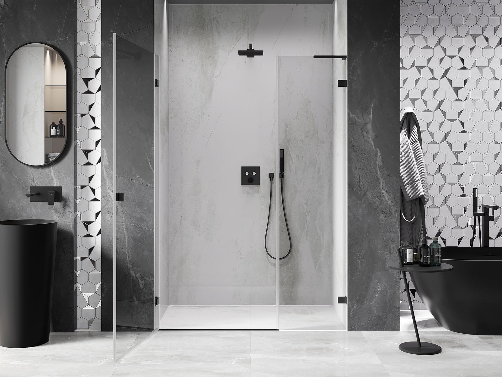 La poignée pratique et confortable est fabriquée en métal durable et résistant. Sa forme à la mode, combinée à une finition assortie à la couleur des profilés, donne à l'ensemble un aspect moderne et stylé, soulignant l'esthétique de chaque salle de bain.