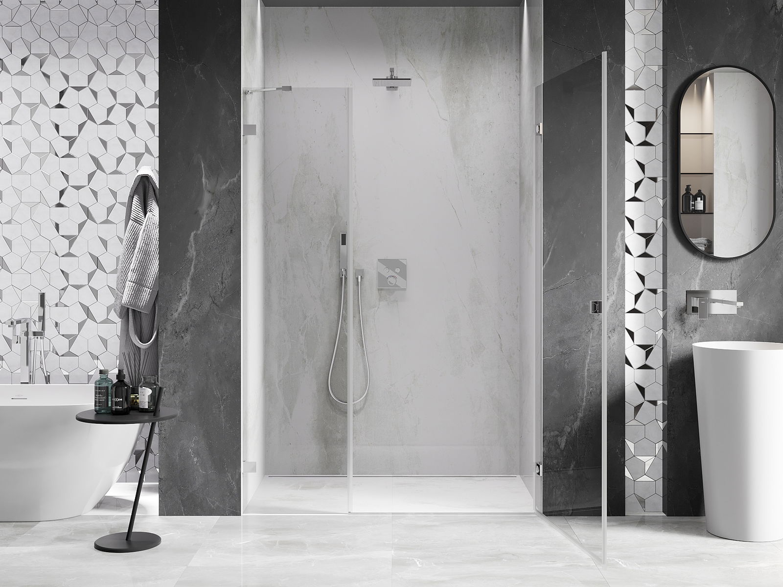 La poignée pratique et confortable est fabriquée en métal durable et résistant. Sa forme à la mode, combinée à une finition assortie à la couleur des profilés, donne à l'ensemble un aspect moderne et stylé, soulignant l'esthétique de chaque salle de bain.