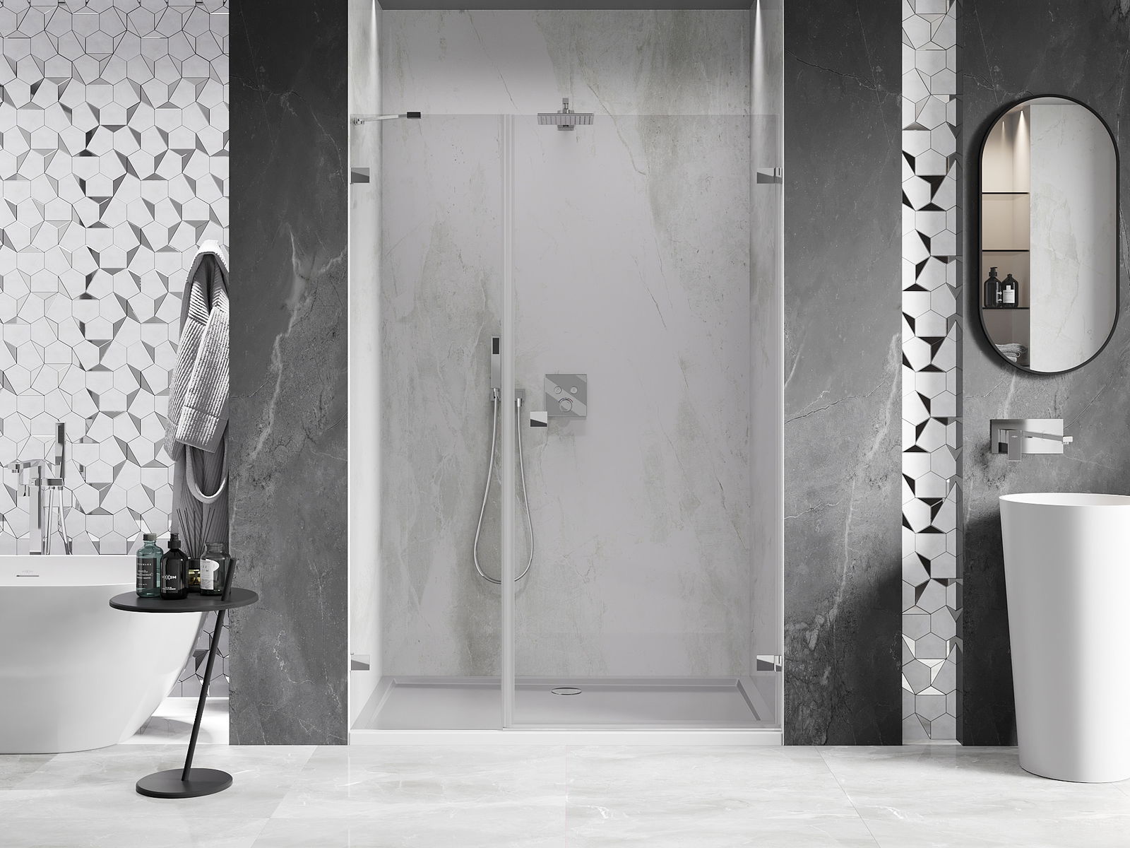 La poignée pratique et confortable est fabriquée en métal durable et résistant. Sa forme à la mode, combinée à une finition assortie à la couleur des profilés, donne à l'ensemble un aspect moderne et stylé, soulignant l'esthétique de chaque salle de bain.