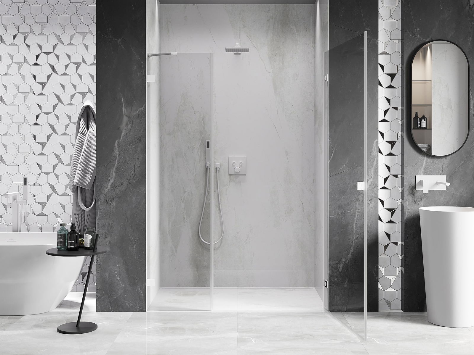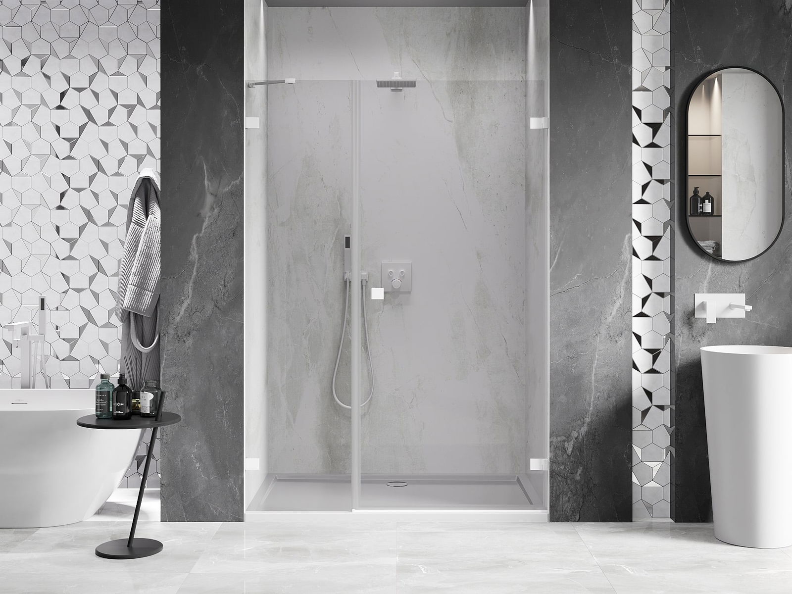 La poignée pratique et confortable est fabriquée en métal durable et résistant. Sa forme à la mode, combinée à une finition assortie à la couleur des profilés, donne à l'ensemble un aspect moderne et stylé, soulignant l'esthétique de chaque salle de bain.