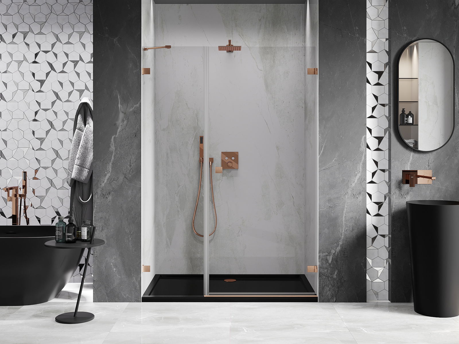 La poignée pratique et confortable est fabriquée en métal durable et résistant. Sa forme à la mode, combinée à une finition assortie à la couleur des profilés, donne à l'ensemble un aspect moderne et stylé, soulignant l'esthétique de chaque salle de bain.