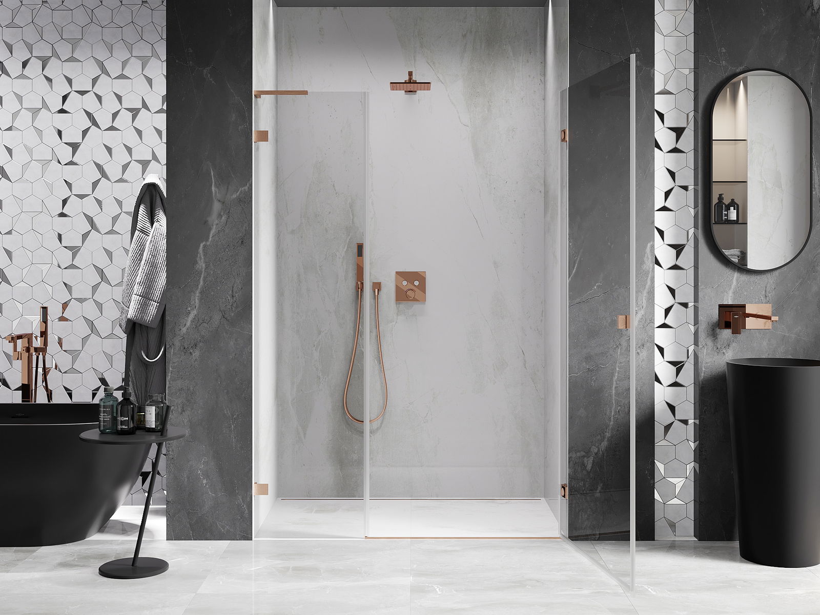La poignée pratique et confortable est fabriquée en métal durable et résistant. Sa forme à la mode, combinée à une finition assortie à la couleur des profilés, donne à l'ensemble un aspect moderne et stylé, soulignant l'esthétique de chaque salle de bain.