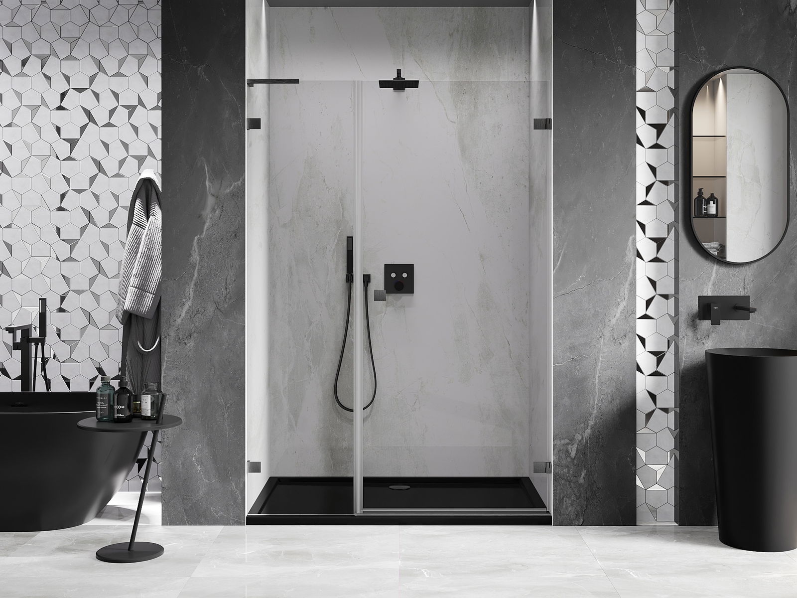 La poignée pratique et confortable est fabriquée en métal durable et résistant. Sa forme à la mode, combinée à une finition assortie à la couleur des profilés, donne à l'ensemble un aspect moderne et stylé, soulignant l'esthétique de chaque salle de bain.