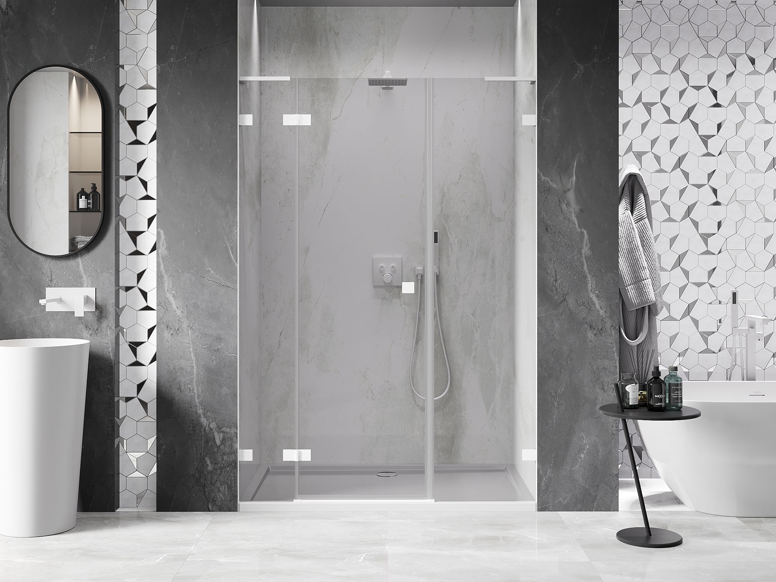 La poignée pratique et confortable est fabriquée en métal durable et résistant. Sa forme à la mode, combinée à une finition assortie à la couleur des profilés, donne à l'ensemble un aspect moderne et stylé, soulignant l'esthétique de chaque salle de bain.