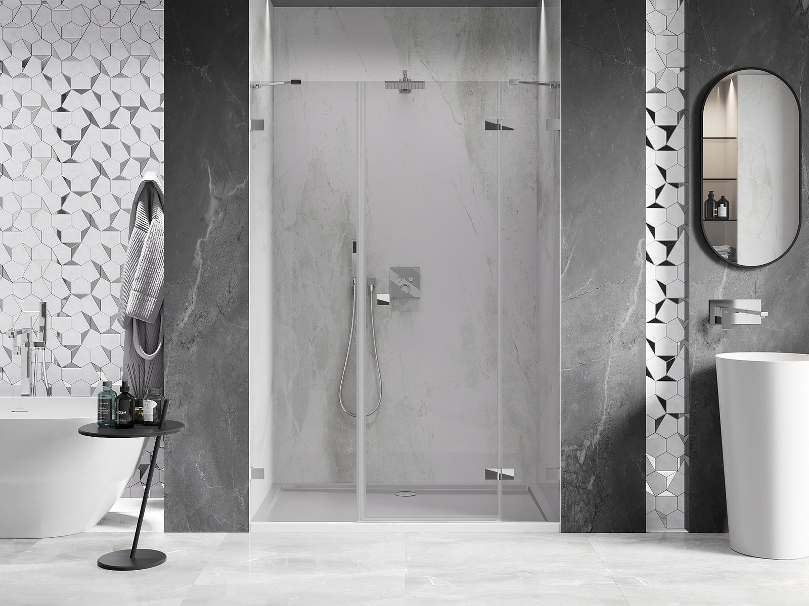 La poignée pratique et confortable est fabriquée en métal durable et résistant. Sa forme à la mode, combinée à une finition assortie à la couleur des profilés, donne à l'ensemble un aspect moderne et stylé, soulignant l'esthétique de chaque salle de bain.
