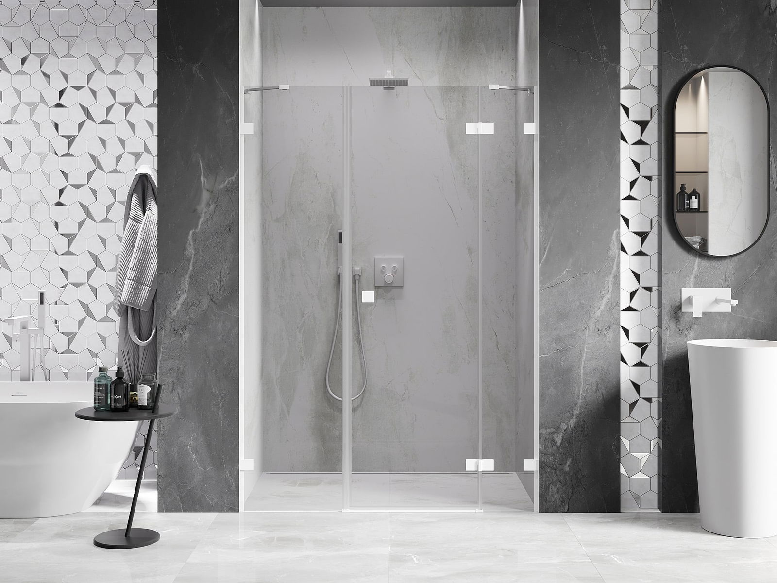 La poignée pratique et confortable est fabriquée en métal durable et résistant. Sa forme à la mode, combinée à une finition assortie à la couleur des profilés, donne à l'ensemble un aspect moderne et stylé, soulignant l'esthétique de chaque salle de bain.