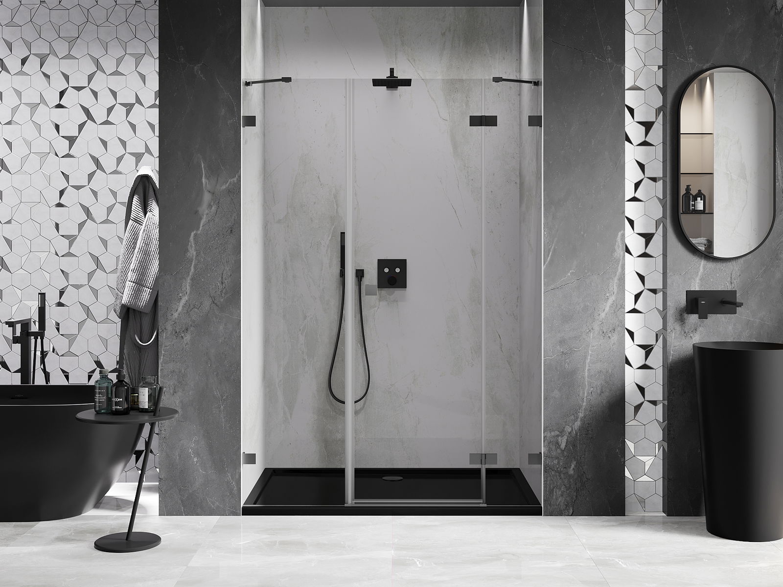 La poignée pratique et confortable est fabriquée en métal durable et résistant. Sa forme à la mode, combinée à une finition assortie à la couleur des profilés, donne à l'ensemble un aspect moderne et stylé, soulignant l'esthétique de chaque salle de bain.