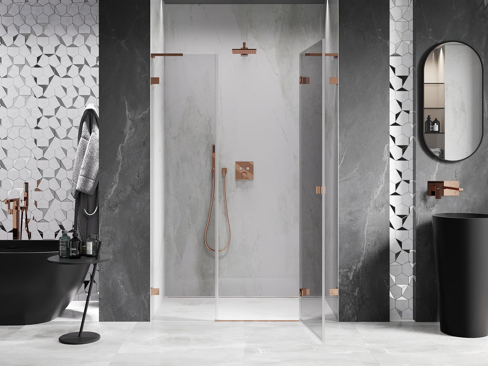 La poignée pratique et confortable est fabriquée en métal durable et résistant. Sa forme à la mode, combinée à une finition assortie à la couleur des profilés, donne à l'ensemble un aspect moderne et stylé, soulignant l'esthétique de chaque salle de bain.