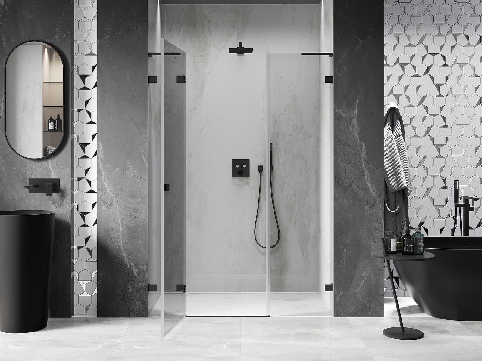 La poignée pratique et confortable est fabriquée en métal durable et résistant. Sa forme à la mode, combinée à une finition assortie à la couleur des profilés, donne à l'ensemble un aspect moderne et stylé, soulignant l'esthétique de chaque salle de bain.