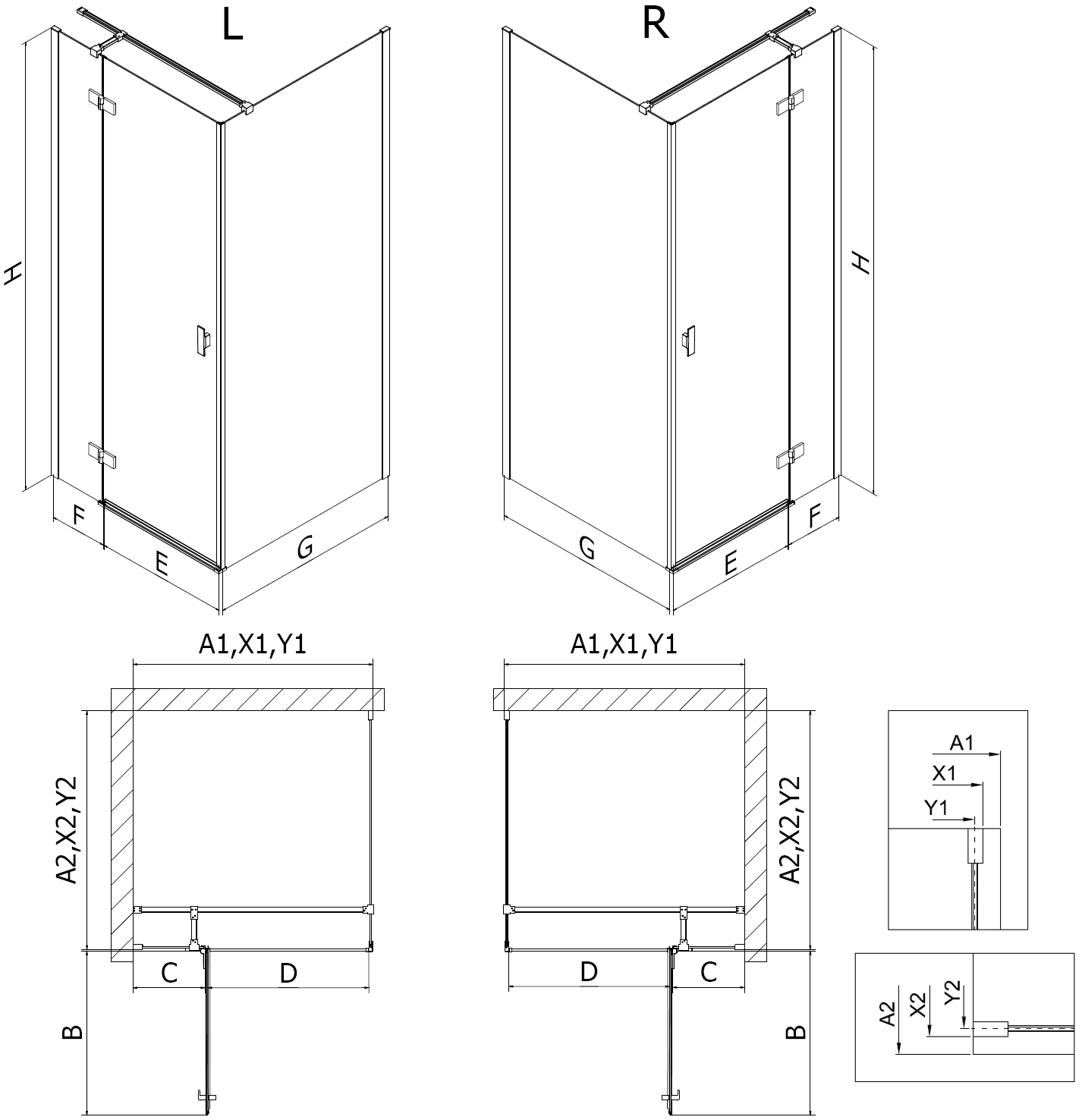 Taille : 90x80 cm (porte droite 90 cm, paroi 80 cm)