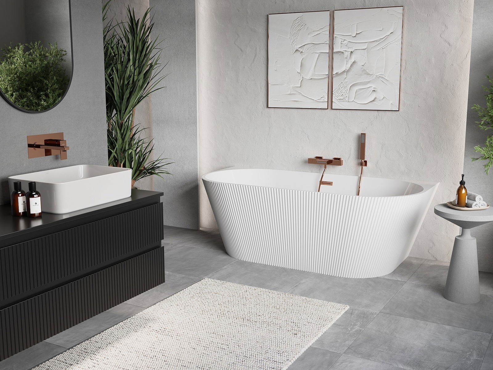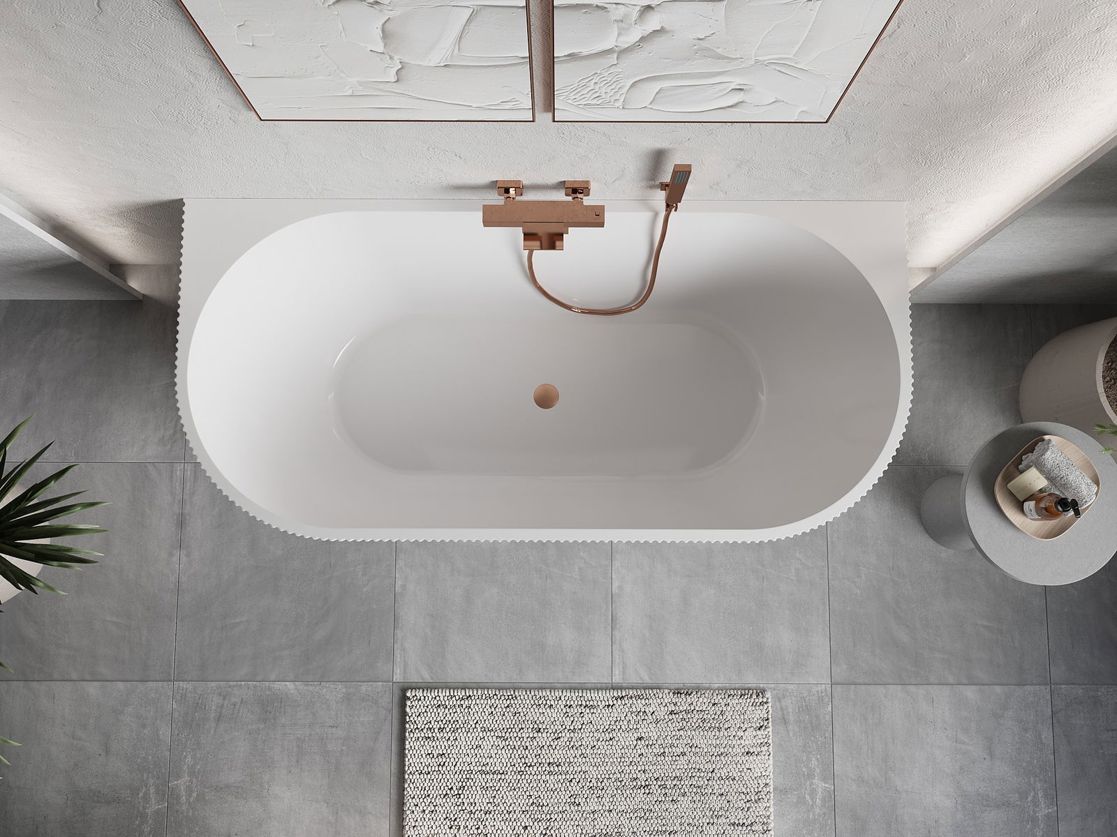 Mexen Oris baignoire autoportante murale nervurée 150 x 75 cm, blanche, trop-plein en cuivre brossé - 52871507500-65
