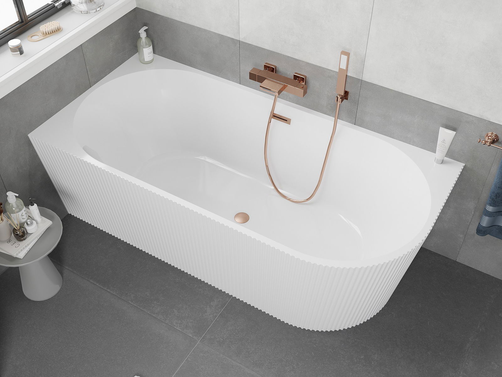 Mexen Silo baignoire autoportante d'angle gauche rainurée 170 x 80 cm, blanche, trop-plein en cuivre brossé - 52891708000L-65