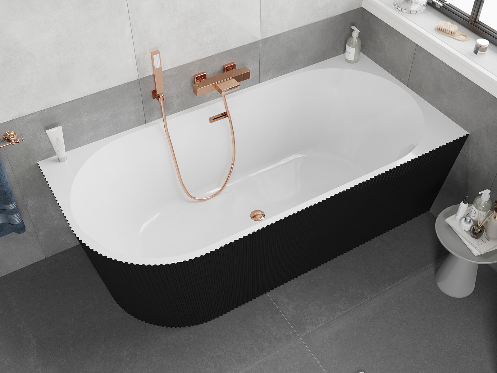 Mexen Silo baignoire autoportante d'angle droite cannelée 150 x 75 cm, blanche/noire, trop-plein or rose - 52891507575P-60