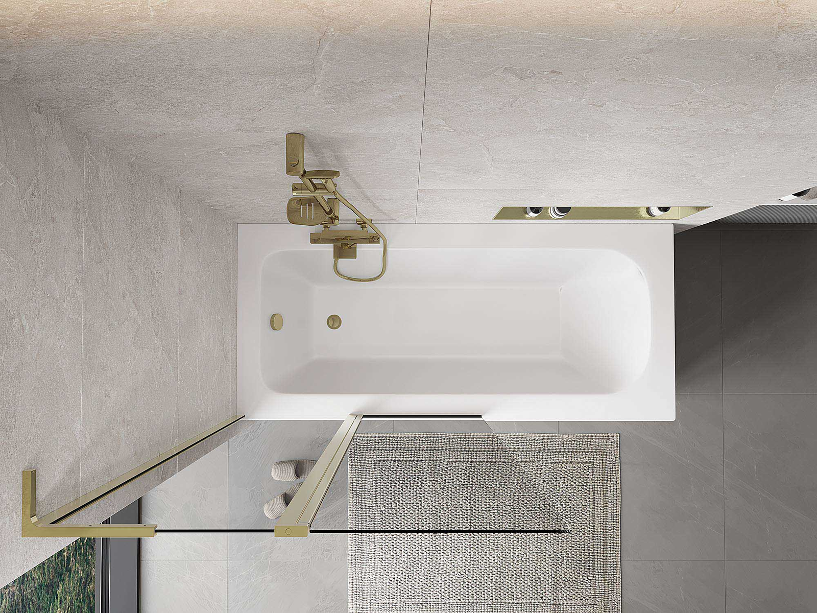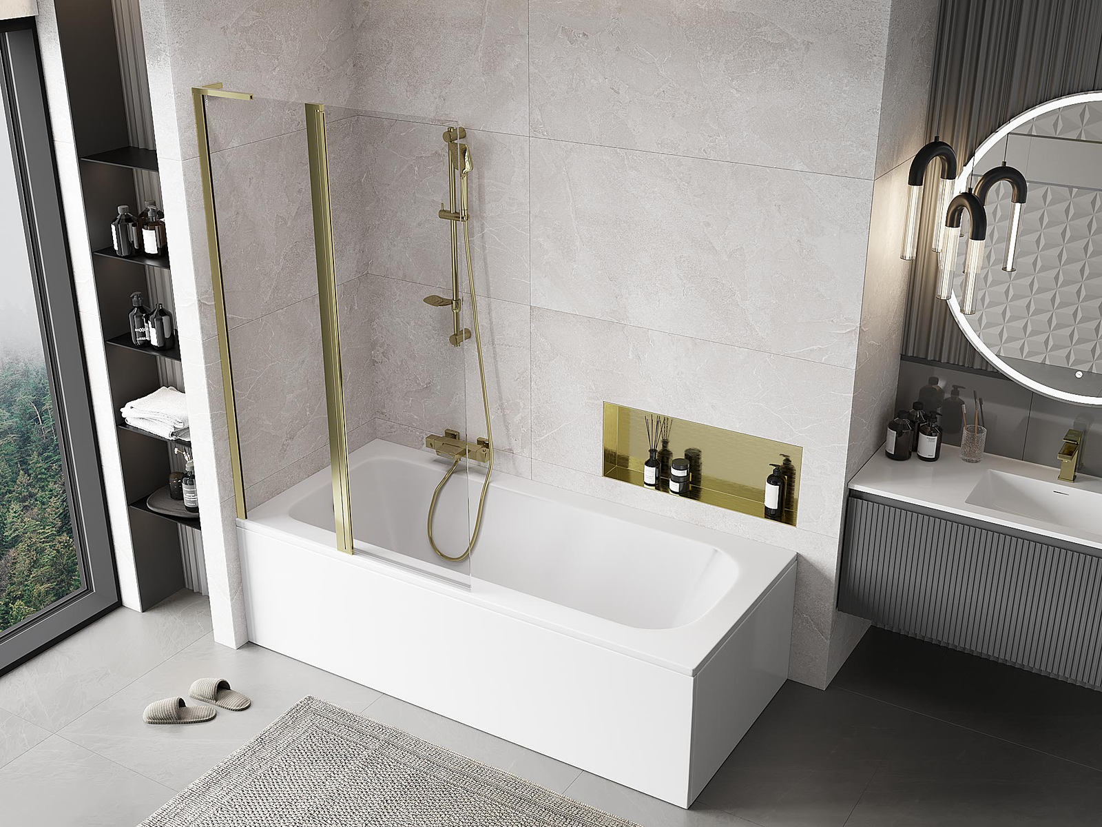 Paravent composé de deux battants pouvant être repliés. Cette solution permet d'économiser plus d'espace dans la salle de bain et de profiter librement du reste de l'espace lorsque nous n'utilisons pas la zone de bain.
