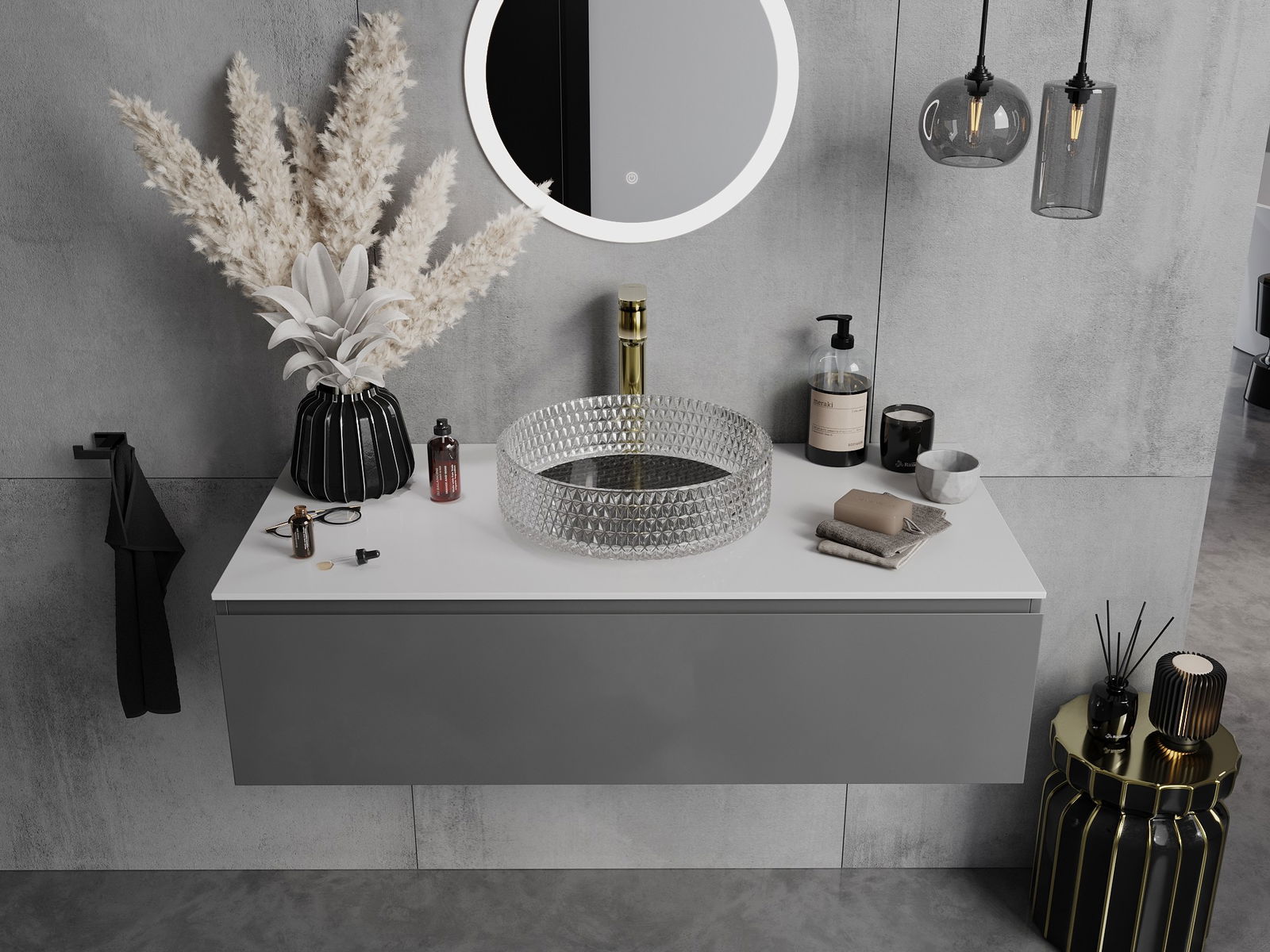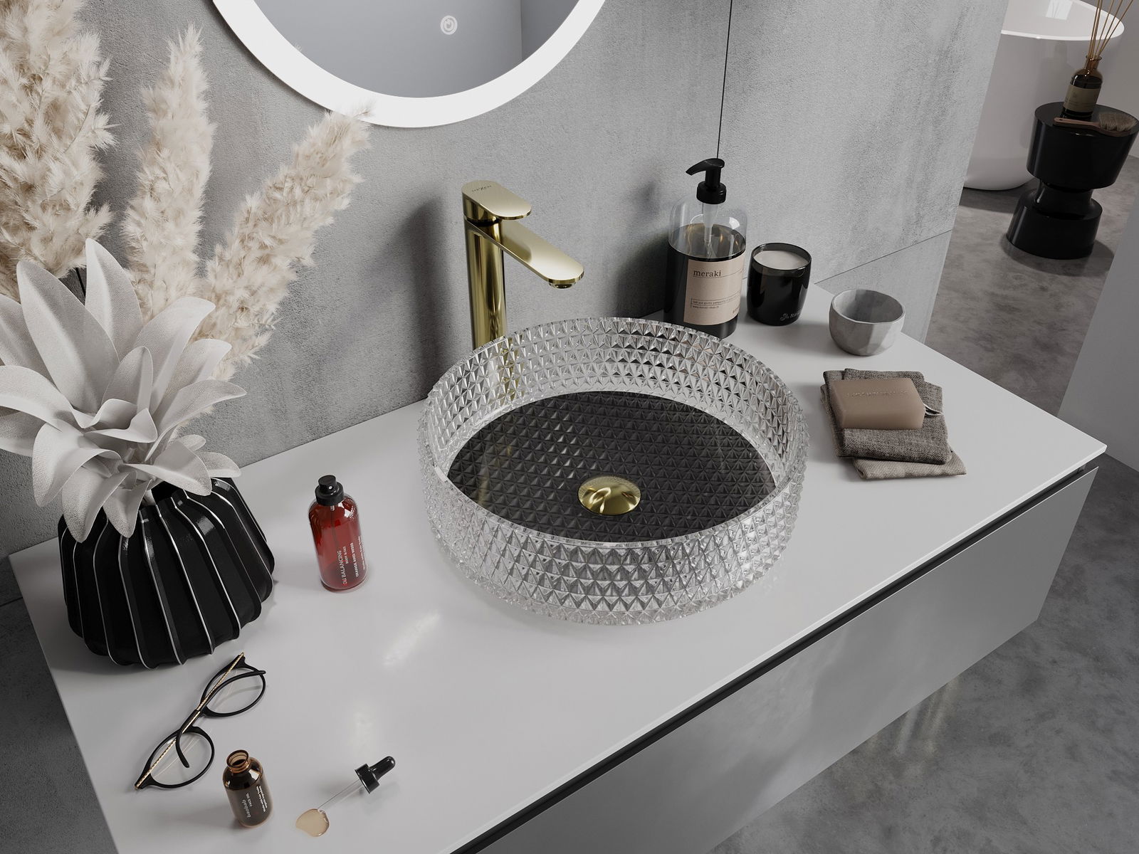 Ce lavabo se distingue par sa structure cristalline unique, qui lui confère un aspect unique et extrêmement efficace. Les cristaux scintillent à la lumière, attirant le regard et apportant une touche d'élégance. Une solution pratique et élégante pour toute salle de bains.