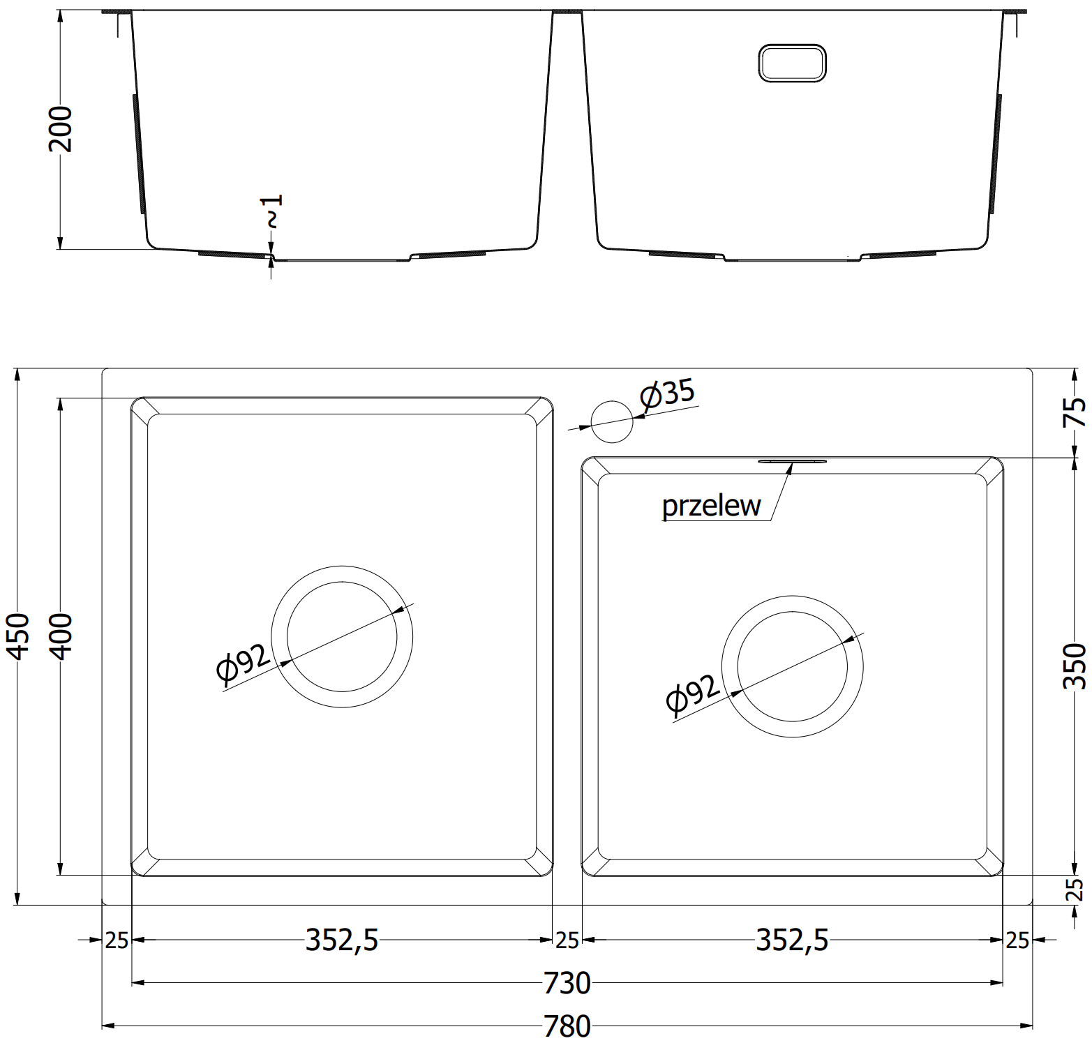 Profondeur de la cuve : 200 mm