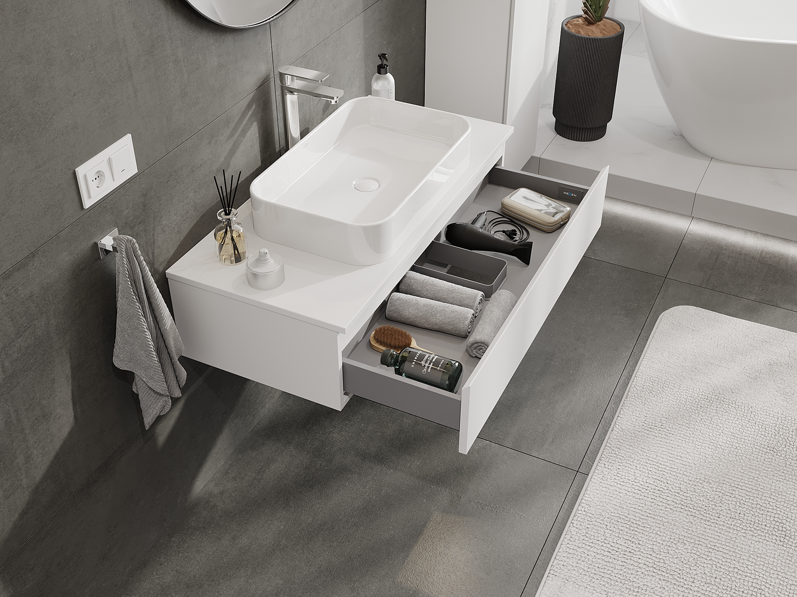 La découpe dans le tiroir est conçue de manière à accueillir le siphon, qui est nécessaire dans les installations de lavabo. Ainsi, le meuble peut être installé de manière pleinement fonctionnelle, sans devoir renoncer à l'espace du tiroir au profit de l'installation.