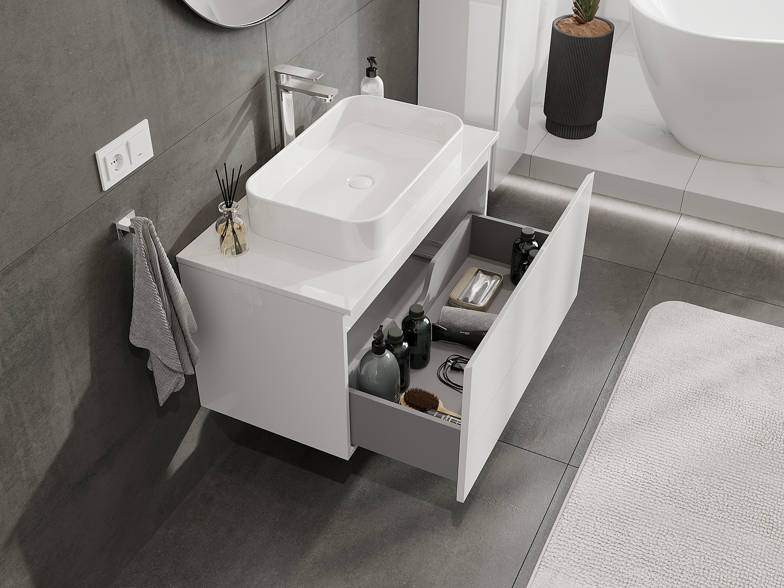 La découpe dans le tiroir est conçue de manière à accueillir le siphon, qui est nécessaire dans les installations de lavabo. Ainsi, le meuble peut être installé de manière pleinement fonctionnelle, sans devoir renoncer à l'espace du tiroir au profit de l'installation.