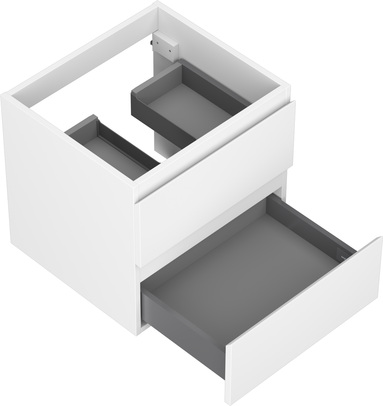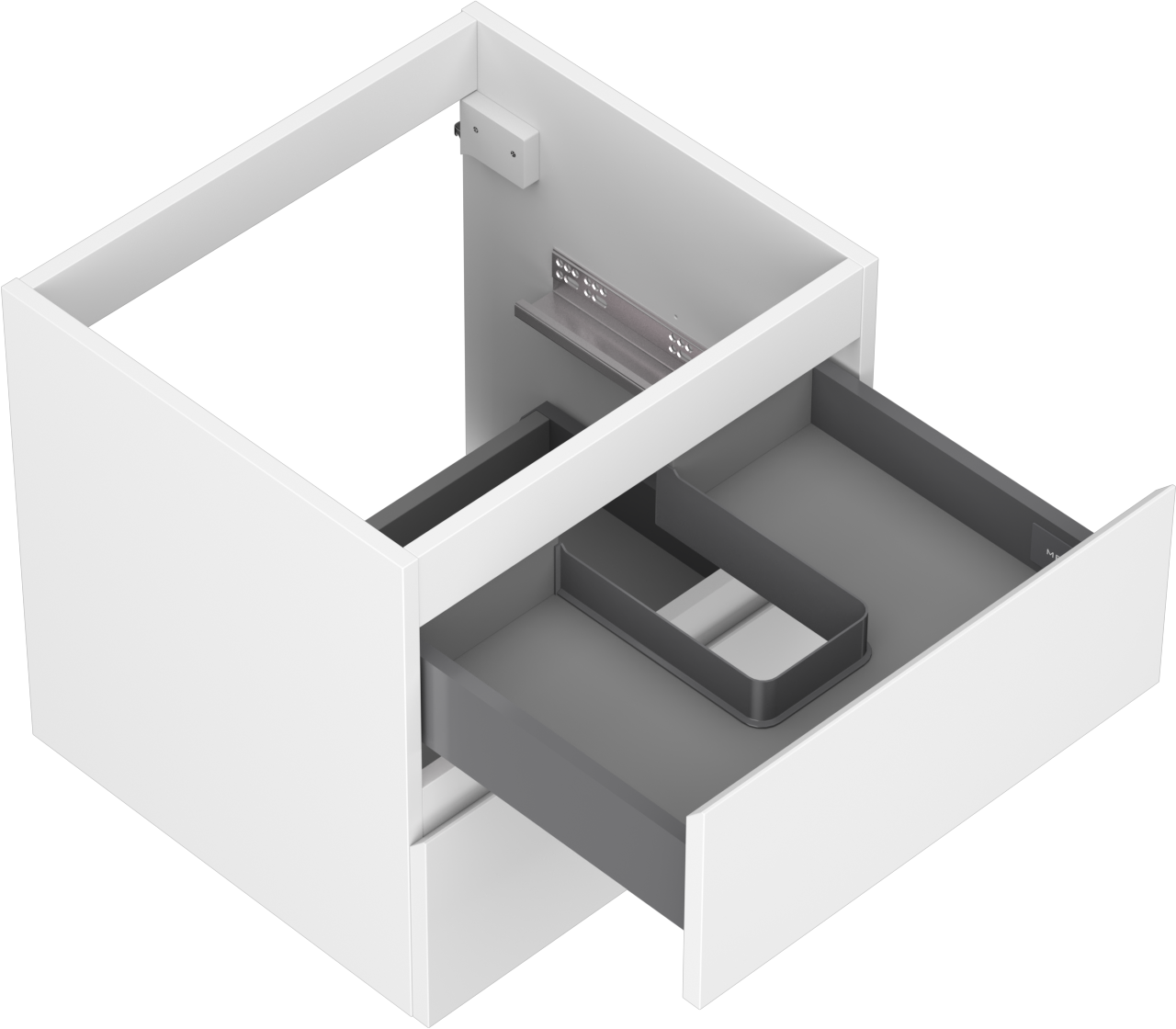 La découpe dans le tiroir est conçue de manière à accueillir le siphon, qui est nécessaire dans les installations de lavabo. Ainsi, le meuble peut être installé de manière pleinement fonctionnelle, sans devoir renoncer à l'espace du tiroir au profit de l'installation.