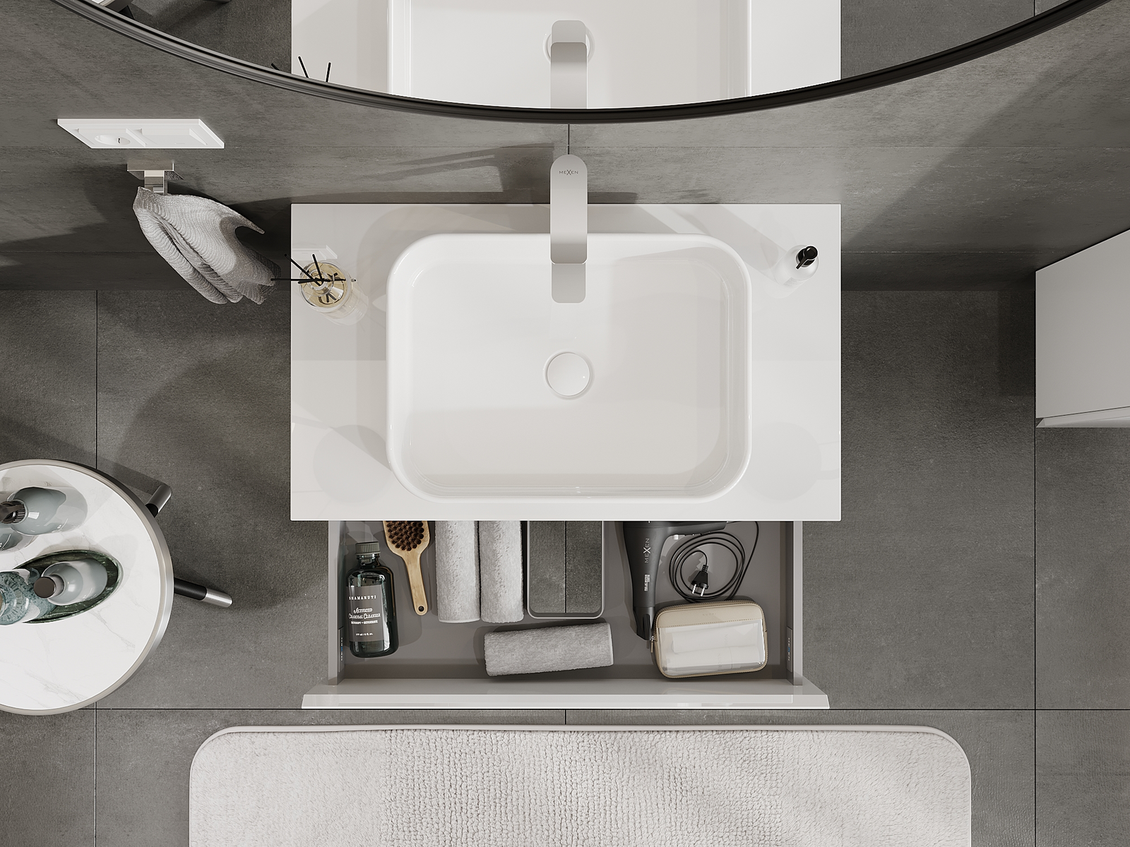 La découpe dans le tiroir est conçue de manière à accueillir le siphon, qui est nécessaire dans les installations de lavabo. Ainsi, le meuble peut être installé de manière pleinement fonctionnelle, sans devoir renoncer à l'espace du tiroir au profit de l'installation.