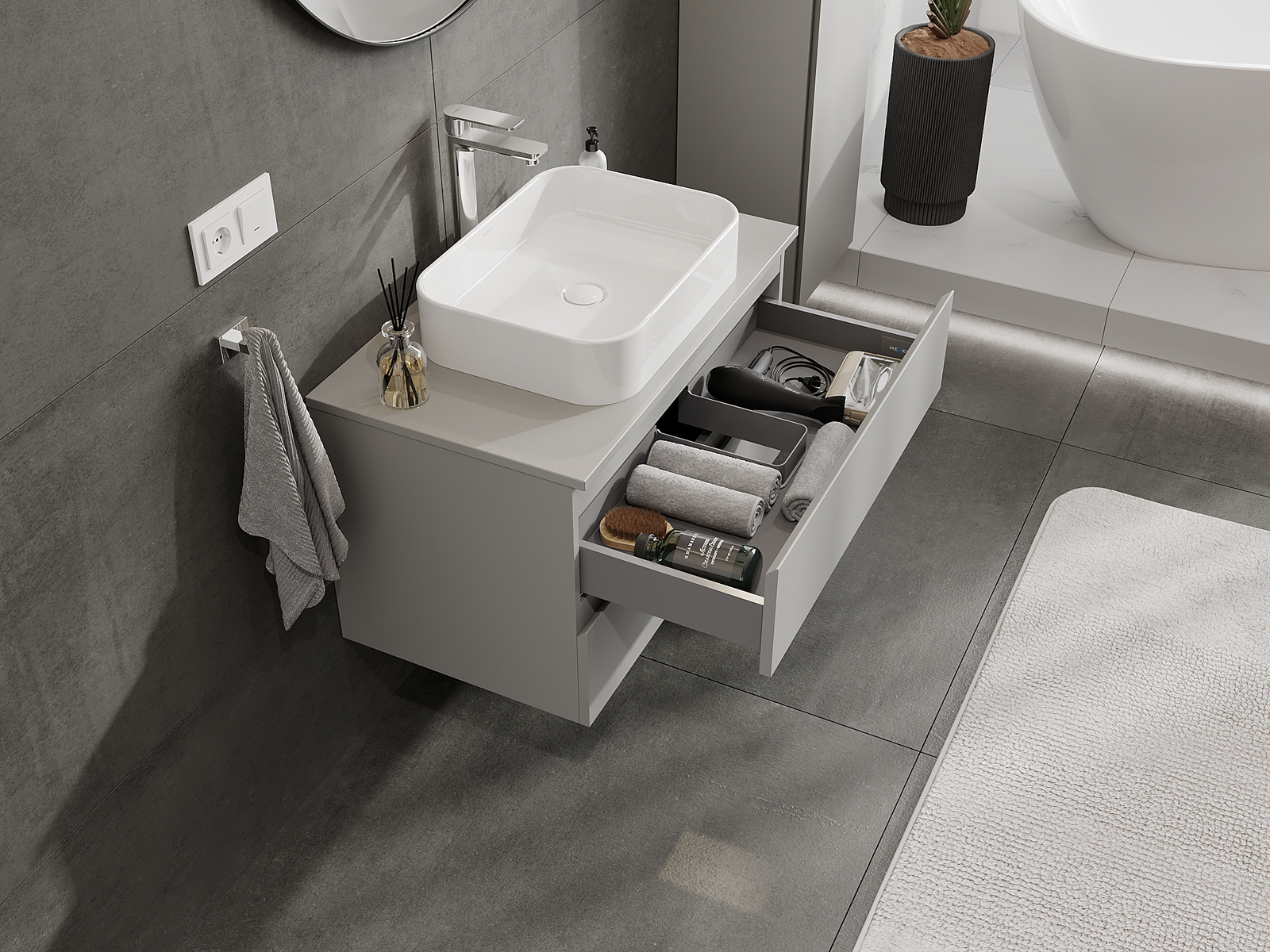 La découpe dans le tiroir est conçue de manière à accueillir le siphon, qui est nécessaire dans les installations de lavabo. Ainsi, le meuble peut être installé de manière pleinement fonctionnelle, sans devoir renoncer à l'espace du tiroir au profit de l'installation.