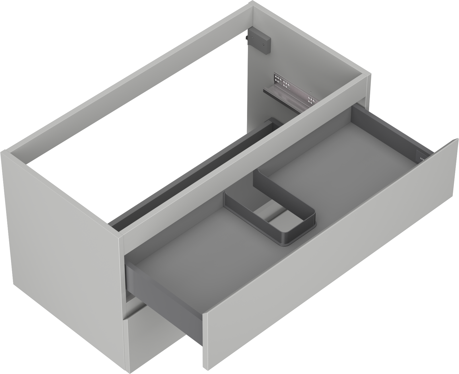 La découpe dans le tiroir est conçue de manière à accueillir le siphon, qui est nécessaire dans les installations de lavabo. Ainsi, le meuble peut être installé de manière pleinement fonctionnelle, sans devoir renoncer à l'espace du tiroir au profit de l'installation.
