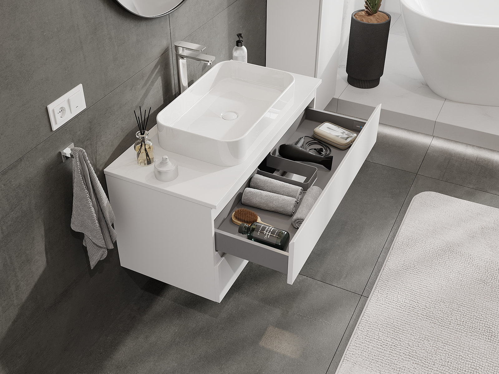 La découpe dans le tiroir est conçue de manière à accueillir le siphon, qui est nécessaire dans les installations de lavabo. Ainsi, le meuble peut être installé de manière pleinement fonctionnelle, sans devoir renoncer à l'espace du tiroir au profit de l'installation.
