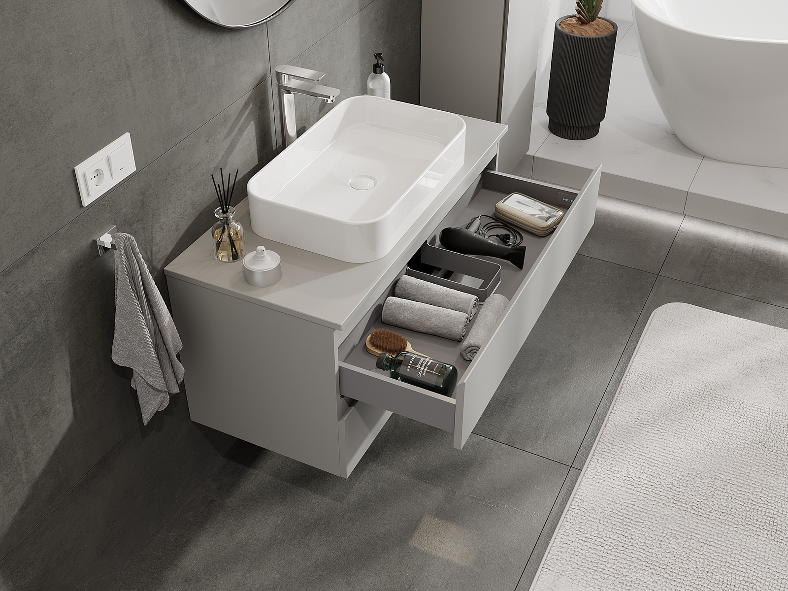 La découpe dans le tiroir est conçue de manière à accueillir le siphon, qui est nécessaire dans les installations de lavabo. Ainsi, le meuble peut être installé de manière pleinement fonctionnelle, sans devoir renoncer à l'espace du tiroir au profit de l'installation.