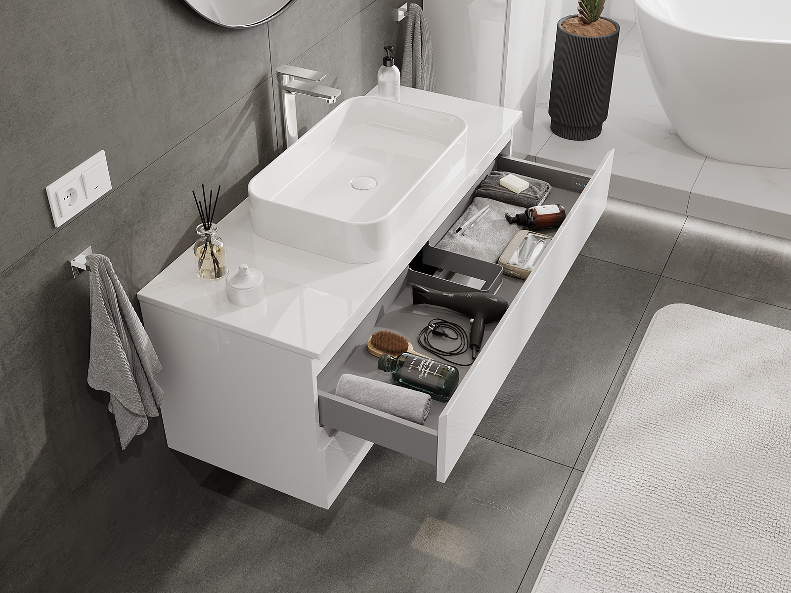 La découpe dans le tiroir est conçue de manière à accueillir le siphon, qui est nécessaire dans les installations de lavabo. Ainsi, le meuble peut être installé de manière pleinement fonctionnelle, sans devoir renoncer à l'espace du tiroir au profit de l'installation.