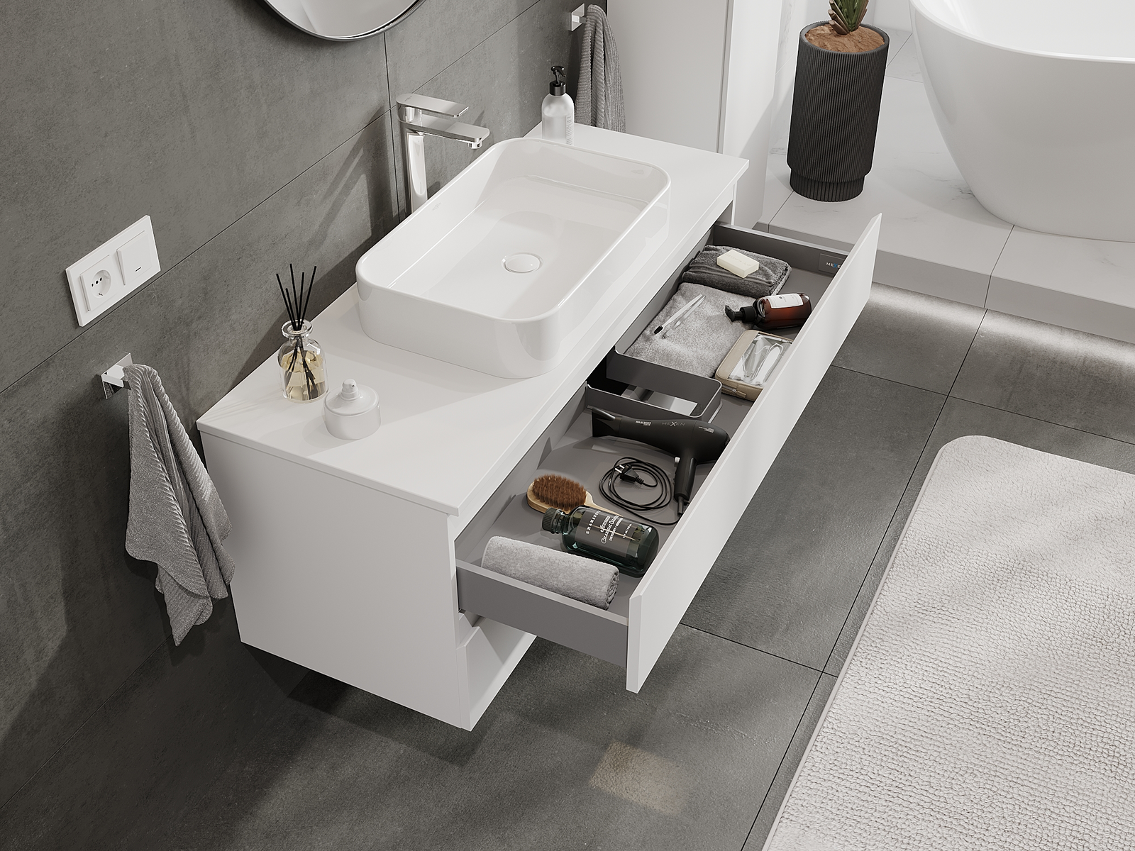 La découpe dans le tiroir est conçue de manière à accueillir le siphon, qui est nécessaire dans les installations de lavabo. Ainsi, le meuble peut être installé de manière pleinement fonctionnelle, sans devoir renoncer à l'espace du tiroir au profit de l'installation.