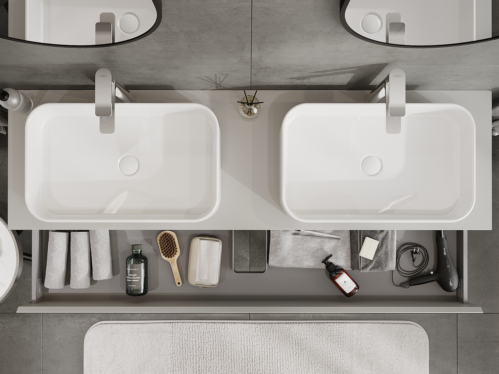La découpe dans le tiroir est conçue de manière à accueillir le siphon, qui est nécessaire dans les installations de lavabo. Ainsi, le meuble peut être installé de manière pleinement fonctionnelle, sans devoir renoncer à l'espace du tiroir au profit de l'installation.